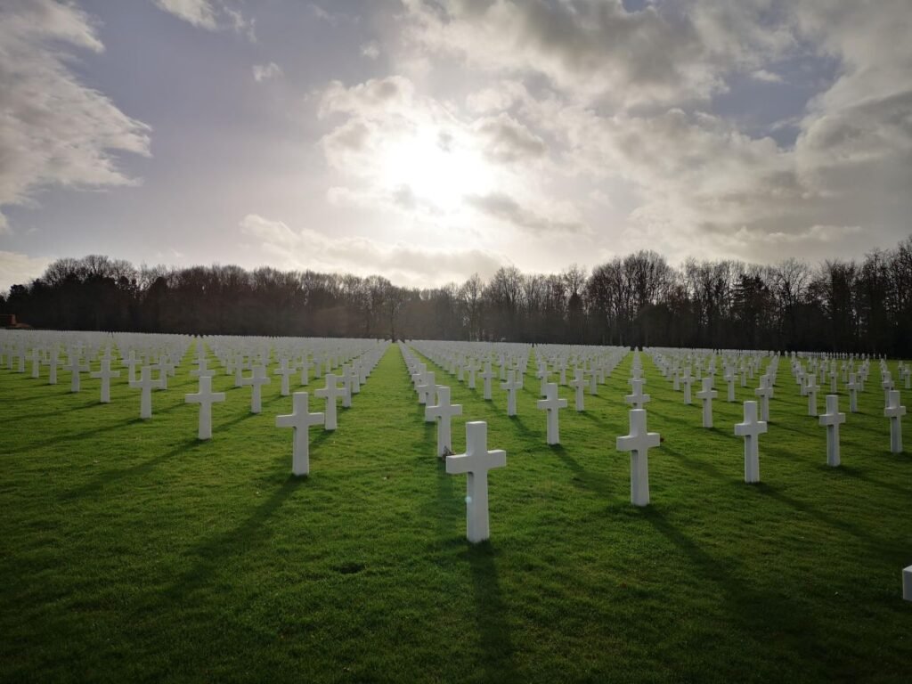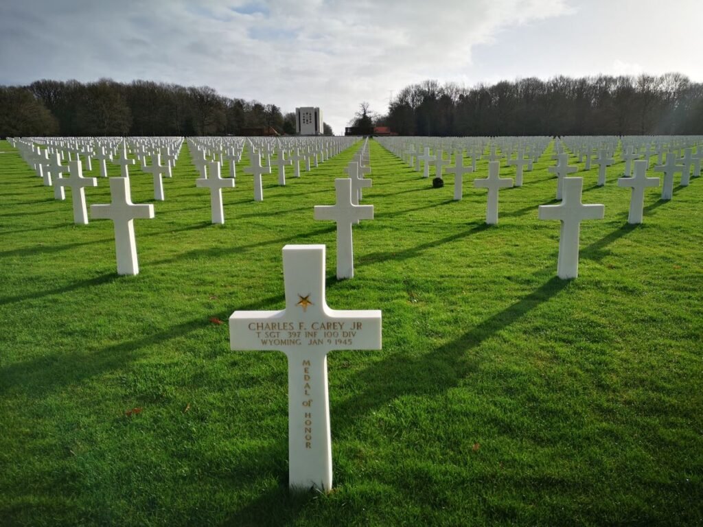 Een paar honderden meters verder ligt het Ardennes American Cemetery and Memorial. Op deze militaire begraafplaats liggen 5162 Amerikaanse soldaten en leden van de Air Force, die tijdens WOII sneuvelden. Onder de gesneuvelden liggen heel wat soldaten die deelnamen aan het Ardennenoffensief. Tijdens mijn onderzoek ter voorbereiding van het Battle of the Bulge Trail (lees er hier meer over) komt deze begraafplaats dan ook meermaals ter sprake, net als die van Henri-Chapelle en Luxemburg. Eén opmerkelijk graf is dat van Charles F. Carey, die postuum de hoogste Amerikaanse militaire onderscheiding kreeg, de Medal of Honor, voor zijn optreden tegen de vijand tijdens gevechten in Frankrijk in januari 1945.