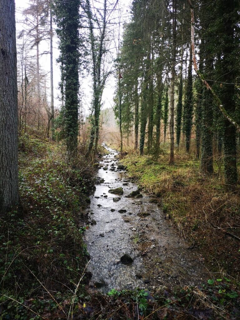 Na mijn bezoek aan de begraafplaats steek ik de N63 over. In plaats van langs de autoweg te lopen, dwars ik een aardappelveld om zo via een autoluwe straat terug bij het rondpunt te komen. Van hieruit kom ik snel in het dorpje Neupré. In de afdaling naar het plaatselijke kerkhof krijg ik een zicht op wat de Ardennen zouden kunnen zijn (maar niet zijn) en links daarvan de Hoge Venen. Na het pittoreske gehucht La Salle volgt de tweede beklimming die me naar het Bos van Esneux brengt. Het is een mooi gemengd bos. Net voor Esneux loopt de GR576 samen met de GR57 om tenslotte aan de Ourthe uit te monden. Hier gaan de GR’s naar links, ik naar rechts richting station.