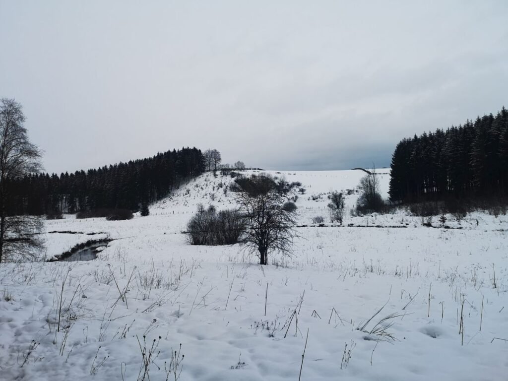 Van Enkelberg zijn we dan maar via de hoogte boven Mürringen naar het dorp toe gewandeld. Daar probeerden we om via Odeskopp toch langs de bosrand te wandelen. Maar nog voor we goed en wel bij het bos waren, stond er al een affiche ivm het toegangsverbod. Na een korte lunchpauze zijn we dan maar via de straten Zum Ohlesief, Am Hölstrich en Zur Hasendelle richting Büllingen gewandeld. Die laatste weg werd niet sneeuwvrij gemaakt en dus werd het gezellig ploeteren door ca. 25 cm sneeuw. Bij het naderen van Büllingen kozen we voor een stukje langs de RAVeL, waar vroeger de spoorlijn tussen Duitsland en de bekende Vennbahn lag en die de loop van de Warche volgt. Hier pikten we de GR56-variante op.