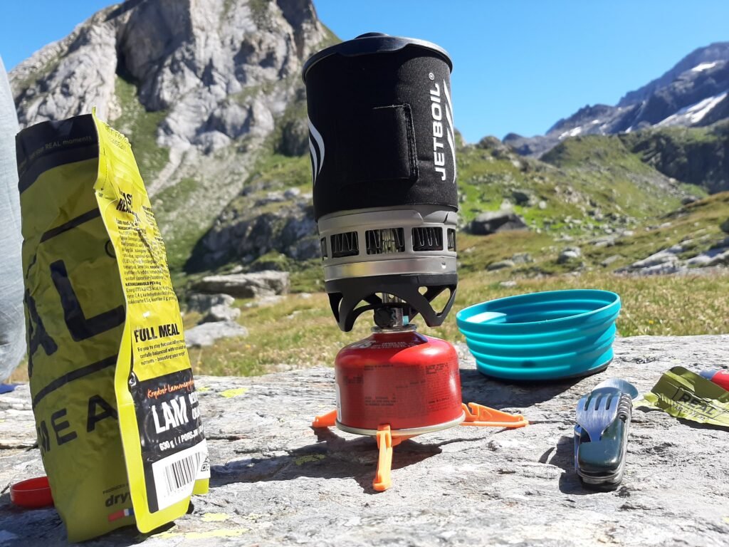Dit is een voorbeeld voor één dag, maar dezelfde berekening maak ik natuurlijk voor elke dag dat ik wandel. Daarna is het zaak de kooktijd en de brandtijd van de gasbrander te kennen, evenals de inhoud van je gaspatroon. Voor de Optimus Crux Lite die ik heb, vind ik op de website van de fabrikant dat het gaat om 3 minuten per liter en een maximale brandtijd van tot 90 minuten met een Optimus-gaspatroon van 230 gram. Dat wil dus zeggen dat ik theoretisch tot 30 liter water (90 / 3) aan de kook kan brengen. Als ik elke dag de 1,35 liter uit mijn voorbeeld zou verbruiken, dan kom ik dus volgens de theorie zo’n 22 dagen (30 liter / 1,35) toe. Een fabrikant houdt echter geen rekening met variabelen die het gasverbruik drastisch kunnen beïnvloeden, zoals de buitentemperatuur, wind en hoogte. Daarom staat er in de beschrijving ook “tot 90 minuten”, want in de realiteit is dat beduidend minder. Meestal kan ik met een gascartouche van 230 gram ongeveer 20 à 22 liter water aan de kook brengen mits gebruik van mijn windscherm.