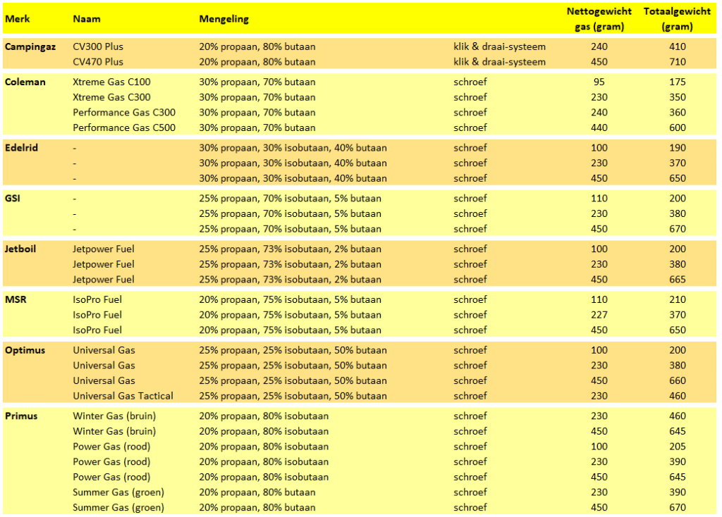 In de bovenstaande tabel heb ik per merk de gasmengelingen vermeld. Zoals je ziet zijn er merken die 70 en 80% butaan gebruiken waarmee je dus in de winter weinig kan aanvangen. Het is niet zo dat omdat er propaan aanwezig is in de mengeling, dat een propaan/butaanmengeling plots goed is voor temperaturen onder het vriespunt. Integendeel. Het aandeel propaan zal gewoon opgebruikt worden en plots zal je, ondanks het feit dat er nog gas – in dit geval butaan – in de cartouche aanwezig is (de vloeistof die je hoort als je de patroon schudt), een zwakke en tenslotte uitdovende vlam krijgen. Kies dus bij lichte vriestemperaturen steeds voor een mengeling van propaan en isobutaan en probeer butaan te vermijden. Je gaat dus best voor gascartouches van Primus (Winter of Power Gas), Jetboil, MSR of GSI. Tijdens de zomermaanden is een mengeling met butaan echter geen verkeerde keuze en kan je het Summer Gas van Primus, evenals gas van Coleman of Campingaz gebruiken. De patronen van Edelrid en Optimus zijn ook goed bij temperaturen tot ruim boven het vriespunt. Bij extreme vrieskou kan je ook met de propaan/isobutaanmengeling weinig aanvangen. Zoals gezegd blijft isobutaan vanaf -12°C in een vloeibare staat en kan dus niet verdampen. En propaan heeft zijn beperkingen door de enorme dampdruk waardoor je dus geen kleine, lichte patronen hebt met 100% propaan.