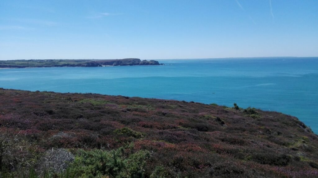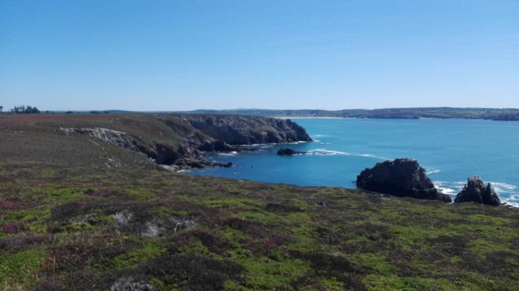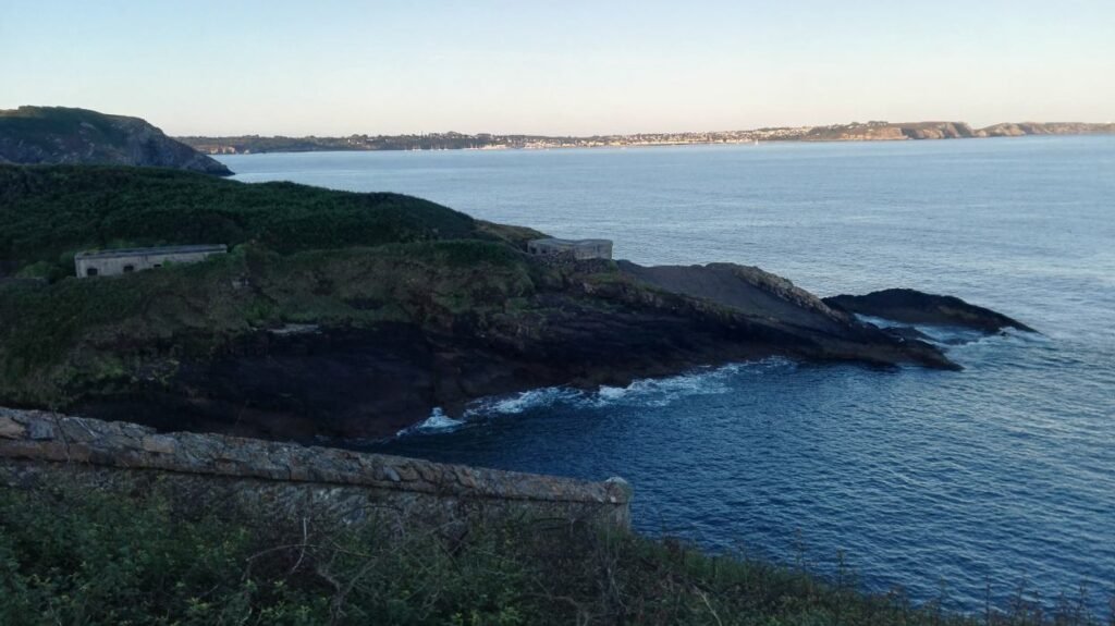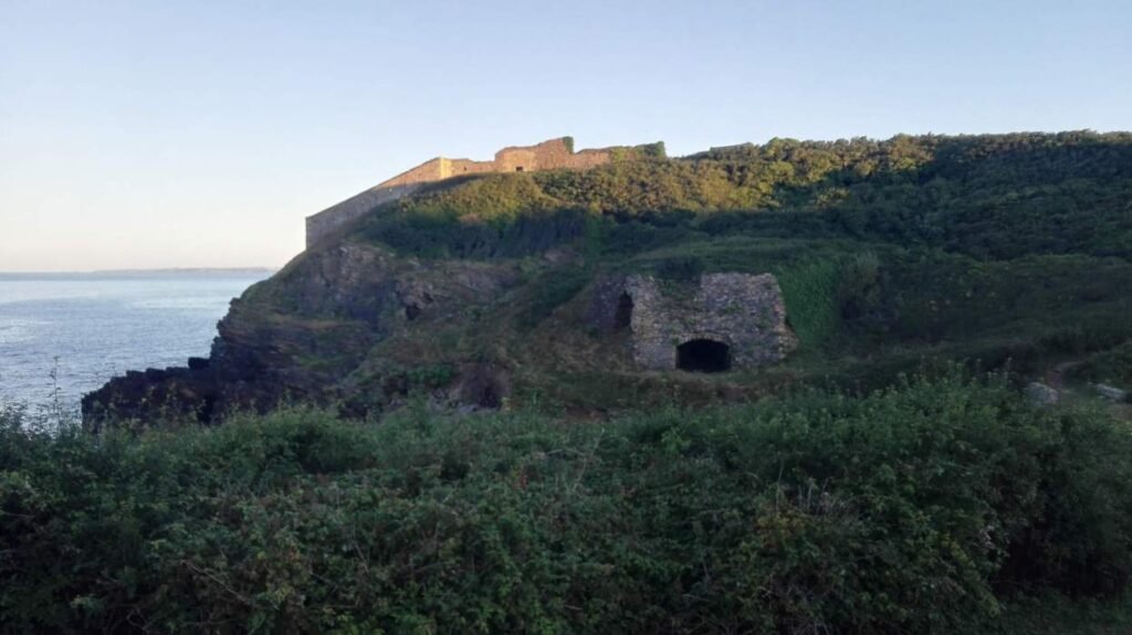 Om 6u word ik gewekt door de haan van de boerderij even verderop. Na het ontbijt ben ik een uurtje later al op pad. Het pad loopt nog een stukje langs de kliffen. Als ik ter hoogte van de Rocher Lieval ben, kan ik achter mij de ruïnes van het oude fort aan de Pointe des Capucins zien. Achteraf gezien jammer dat ik niet even de omweg maakte, want het bouwwerk ziet er vanop afstand best indrukwekkend uit. Het staat op een klein rotsachtig eilandje en is met het vasteland verbonden door een korte brug. Even verderop zijn er nog meer ruïnes te bewonderen met het Fort de la Fraternité waar je zo doorwandelt. Aan de Pointe de Tremet draait de GR linksaf en gaat om het Fort van Quélern heen. Ik ben nu aan de achterkant van het gehucht waar ik gisteren al door wandelde en net als toen is alles hier militair gebied en mag er dus niet gefotografeerd worden. Ik kan slechts een kleine glimp van het fort opvangen bij de hoofdingang. Voor het overige is alles zeer goed verborgen.
