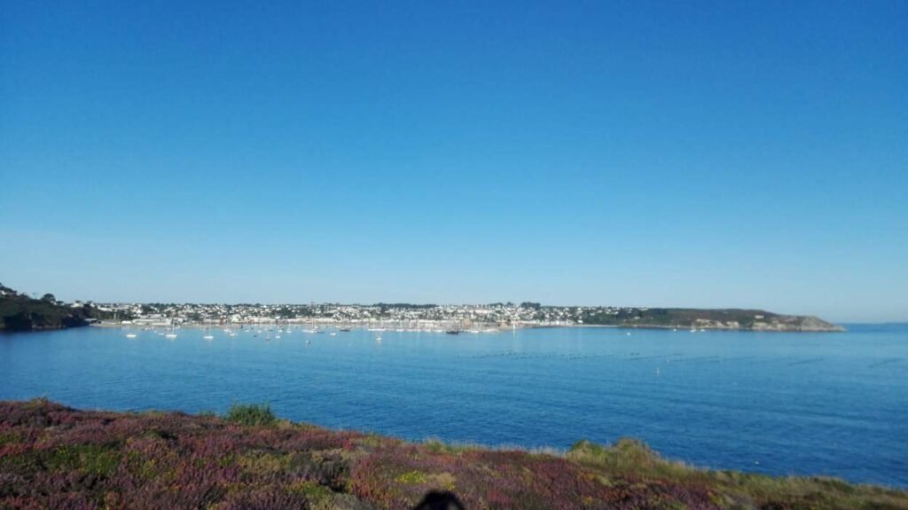 Het strand in de baai van Dinan lijkt eindeloos. Uiteindelijk kom ik aan de Pointe de Dinan met net daarvoor de Château de Dinan. Geen echt kasteel, maar de rotsformaties hebben – mits wat verbeelding – wel wat weg van een château. Het is broeierig heet en de ontbrekende wind en volle zon maken het er niet makkelijker op. Ik kom nog langs vele mooie stukken natuur, maar tegen 16u30 begin ik toch te denken dat het stilaan genoeg is geweest.