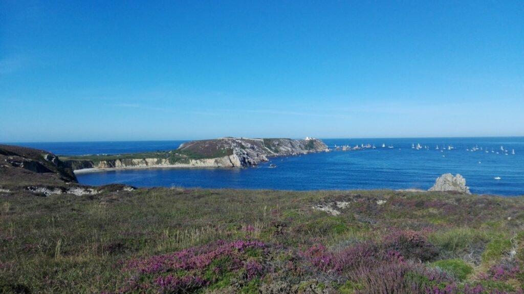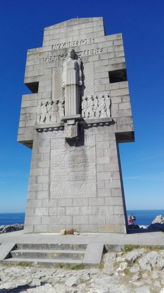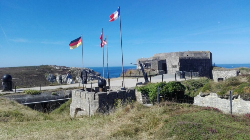 Na het fort daalt de GR via de D355 af richting Camaret-sur-Mer. Het zicht is mooi, maar nog niet zo spectaculair als wat ik vanaf vanmiddag te zien krijg. In Camaret hou ik tegen 9u halt voor een tweede ontbijt. Er is best veel volk op de been. Daar zal een zeilevenement dat hier plaatsheeft wel wat mee te maken hebben. Na deze kleine pauze gaat het verder over de Pointe du Grand Gouin. Opvallend is hier weer de mix tussen oude forten en de modernere Duitse bunkers. Op één daarvan zijn zelfs opvallend veel sporen van gevechten terug te vinden. Eens ik van de pointe richting westen kijk, zie ik de indrukwekkende Pointe du Toulinguet. De GR gaat bizar genoeg eerst richting pointe, die met z’n 50 meter hoogte toch voor kort maar krachtig klimwerk zorgt, om dan parallel met een muur te lopen. Die muur houdt onbevoegden weg, want ook dit is militair gebied. Even verder gaat het wandelpad dan ook weer omlaag en krijg je een mooi uitzicht op de baai van Pen Hat. De hoge golven zijn ideaal voor de vele aanwezige surfers. Na Pen Hat is het weer even klimmen geblazen om aan het Musée Memorial de la Bataille de l’Atlantique te komen. Dat museum herdenkt de strijd in de Atlantische Oceaan tussen Duitsers en geallieerden tijdens WOII. Ik heb het niet bezocht, maar de toegangsprijzen lijken alvast zeer schappelijk.