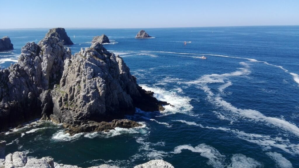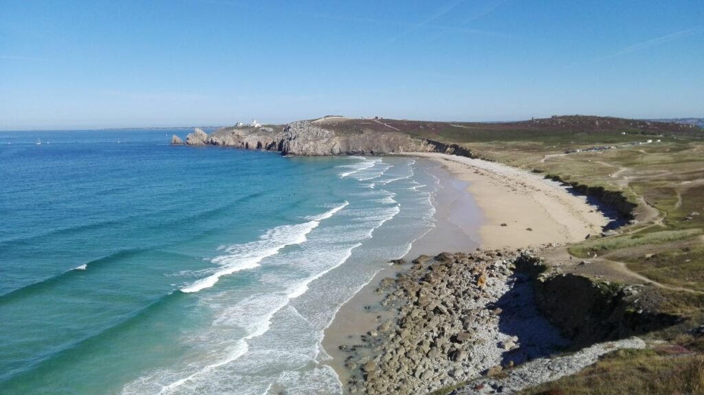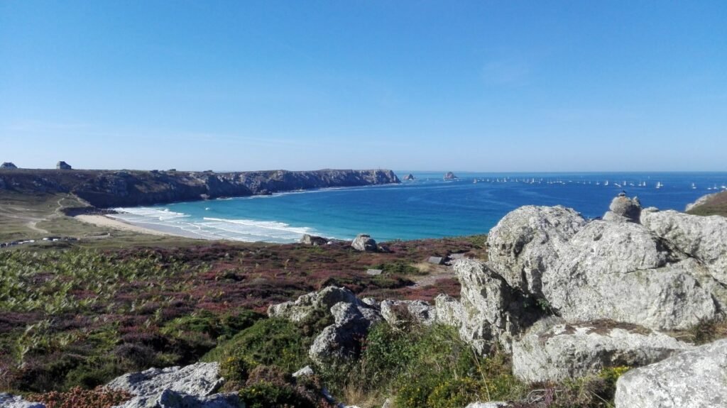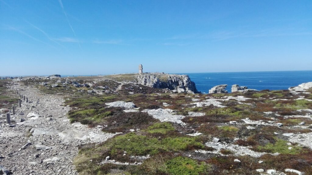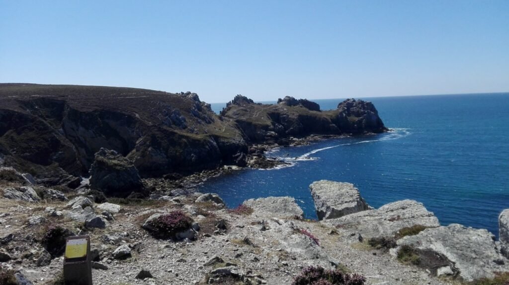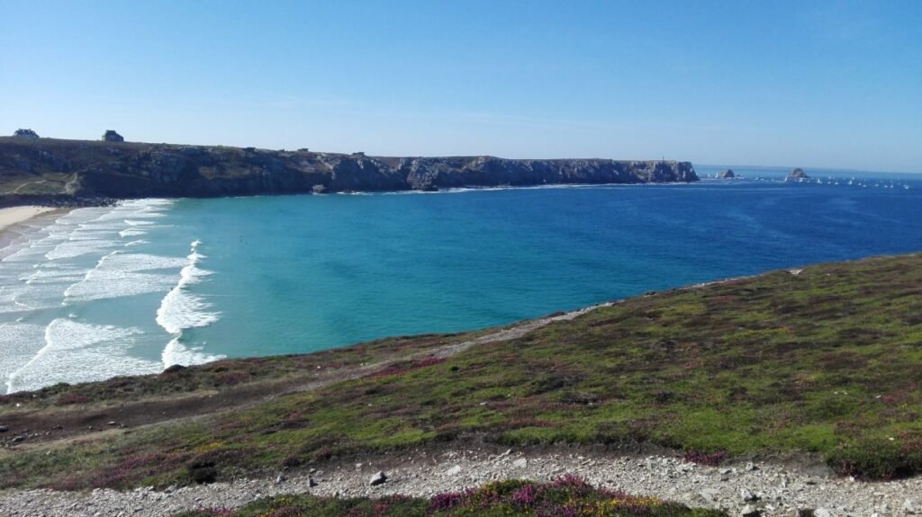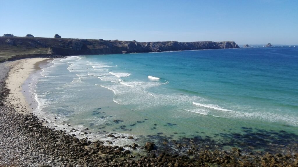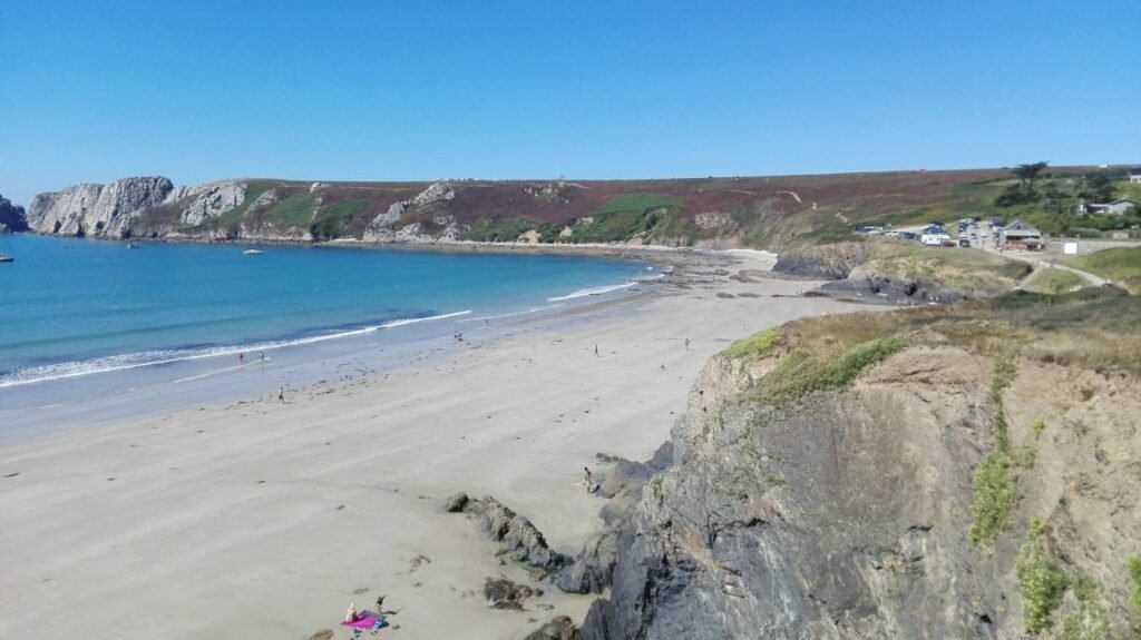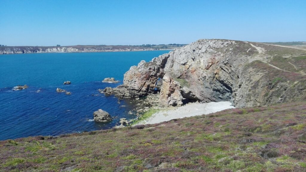 Tegen 11u30 kom ik bij Pen Hir aan. Hier staat sinds 1951 een enorm blauwgranieten kruis dat de Bretoenen moet herdenken die tijdens WOII aan de zijde van de Vrije Fransen onder Charles de Gaulle vochten. Uiteraard is hier een massa volk aanwezig. Ik blijf dan ook niet te lang rondhangen en wandel verder. Ik zie nog de Tas de Pois, een reeks rotsachtige eilandjes dat zich in richting zee uitstrekt vanaf de Pointe de Pen Hir. Na Pen Hir kom je aan het strand van Veryac’h. Er is een bar waar je iets kan eten, maar jammer genoeg zijn alle plaatsen gereserveerd door de vele strandgangers. Net als ik zullen de vele wandelaars die hier langskomen met lege maag moeten verder trekken. Ik drink snel wat en ga dan naar de eerstvolgende eetgelegenheid aan het strand van Kerloc’h, zo’n 5 kilometer verder. Uiteraard zijn de panorama’s prachtig en kan ik niet ophouden met me te vergapen aan de prachtige kliffen en rotsformaties die ik onderweg tegenkom.