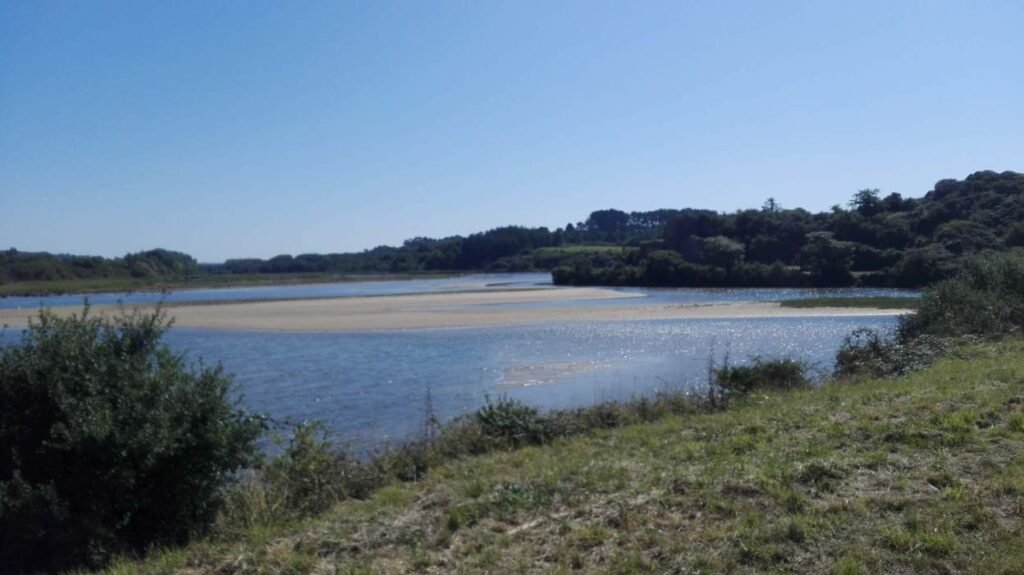 ​Vanaf nu is er geen enkele beschutting tegen de zon en het kost me best veel moeite om een plekje in de schaduw te vinden waar ik mijn lunch kan opeten. Zo kom ik na vijf kilometer aan een schorre, waar het riviertje Aber in zee uitmondt. Als ik aan de Pointe de Raguenez kom, met voor me de Île de l’Aber, zie ik boven aan de parking een drietal bomen staan. Deze bieden mijn inziens voldoende schaduw voor een kleine lunchpauze. Zo gezegd zo gedaan.