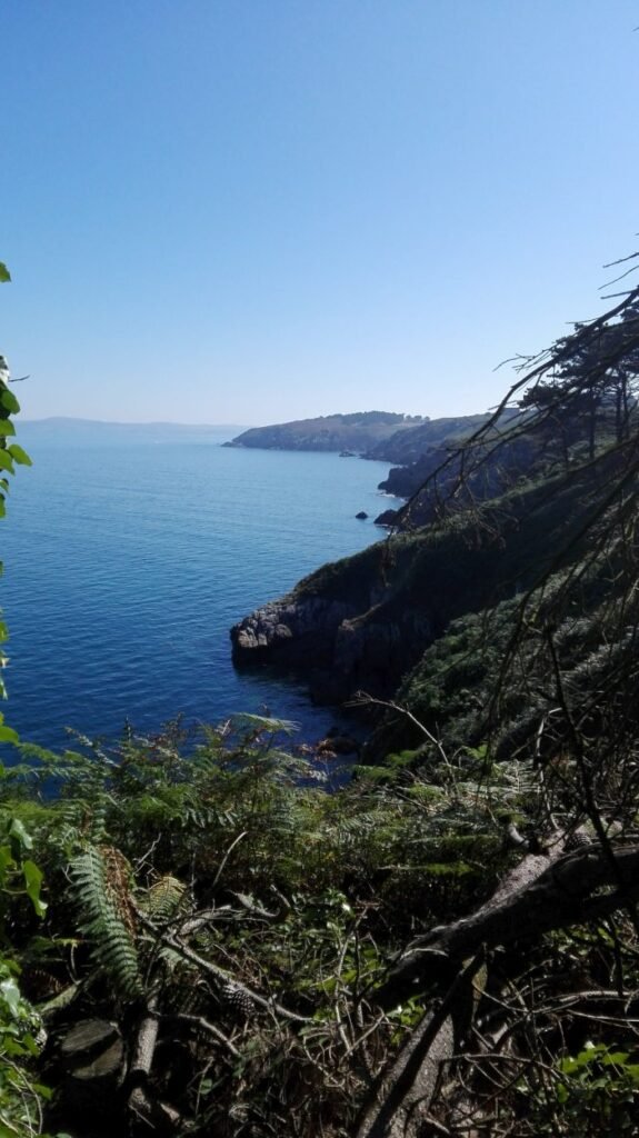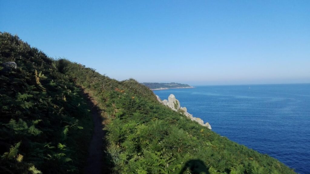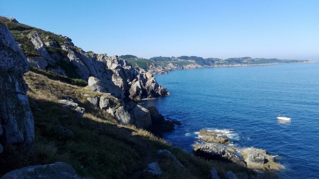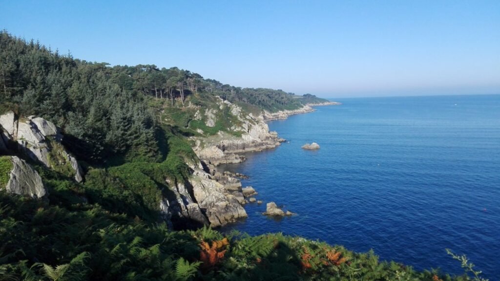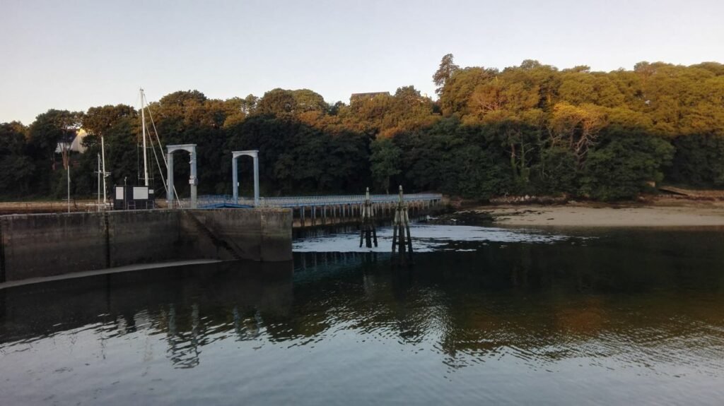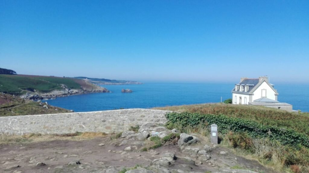 Naar goede gewoonte ben ik om 6 uur uit de veren en probeer me geruisloos uit de voeten te maken. Toch is er iemand die me in het donker veel succes wenst. Iets voor 7u trek ik de deur van de gîte achter me dicht. Je verlaat Douarnenez via de visserijhaven en het Plage des Dames. Op het Île Tristan zie je de witte gebouwen van de vroegere sardienenfabriek. Op het eilandje is er ook een fort en een vuurtoren, maar die zitten tussen de bomen verstopt en kan ik niet zien. Naar het schijnt is het eilandje genoemd naar de eigenaar ten tijde van de Franse Revolutie, toen het kadaster werd opgesteld. Hoe het ook zij, ik verlaat Douarnenez via de loopbrug genoemd naar Jean Marin. Die laatste was één van de stemmen van het BBC-programma “Les Français parlent aux Français” tijdens de Tweede Wereldoorlog en werd in Douarnenez geboren.