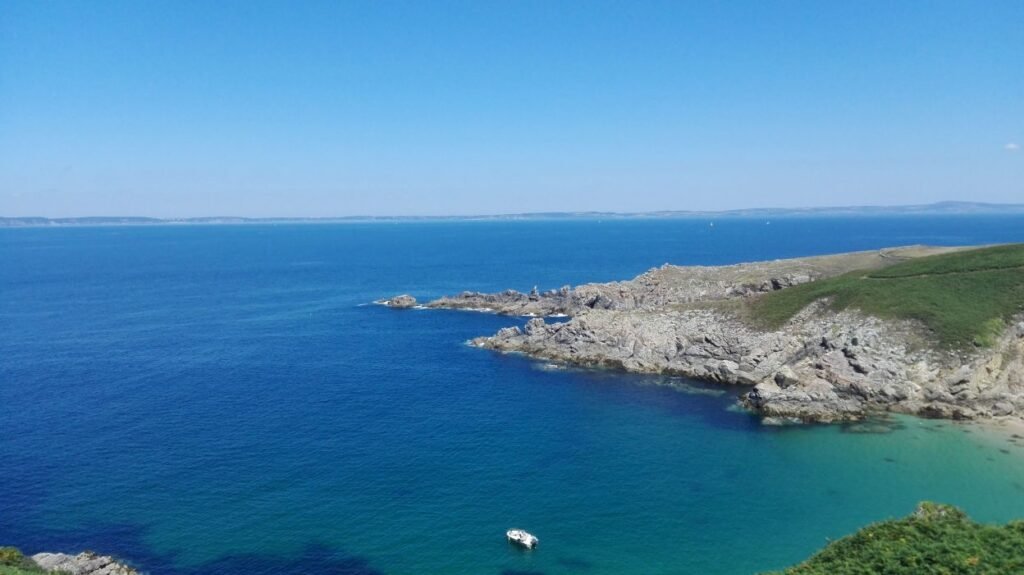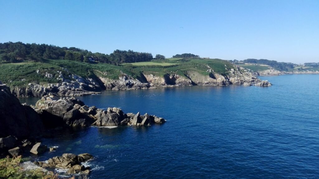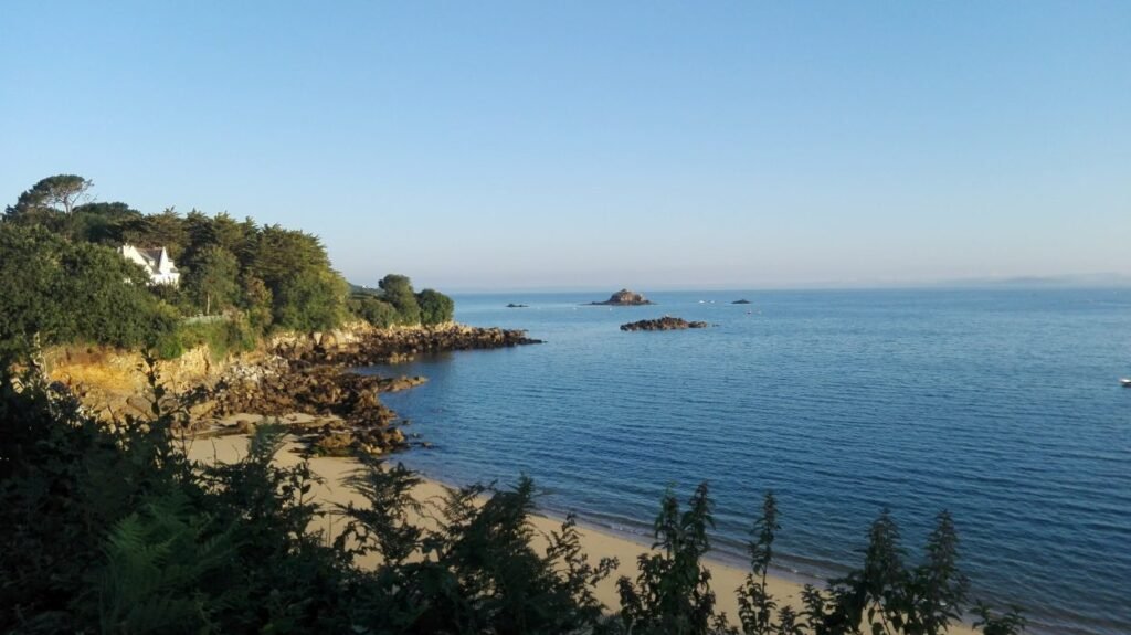 Vandaag staat de zwaarste, maar ook mooiste etappe op het programma. Ik moet zo’n 35 kilometer afleggen tot een private camping bij Kerguerriec. Op zich hoef ik dit niet helemaal te doen en zou een stuk kunnen meeliften. De D7 loopt immers parallel met de kust. Ik ben echter gekomen om te wandelen en dus wil ik zo ver als mogelijk te voet gaan. Als ik voel dat het niet meer gaat, kan ik nog altijd voor de optie liften kiezen. Niet alleen belooft het qua afstand een zware etappe te worden. Qua temperatuur is het vandaag de warmste wandeldag tot dusver én er zijn bijna geen waterpunten, tenzij ik naar het hinterland trek en bij mensen aanbel.