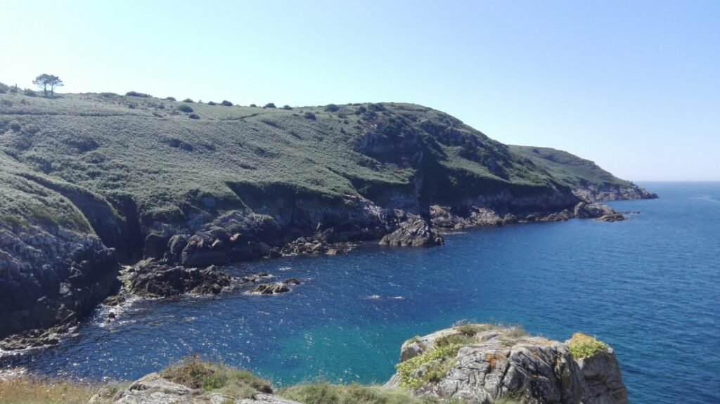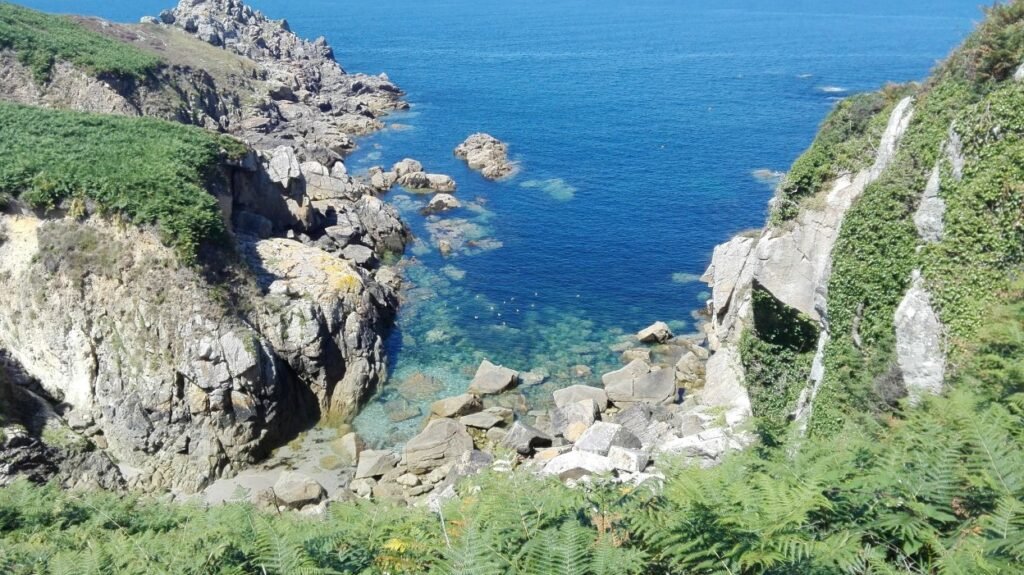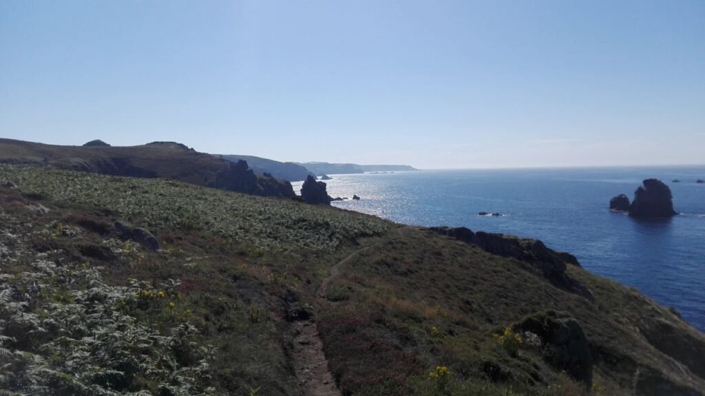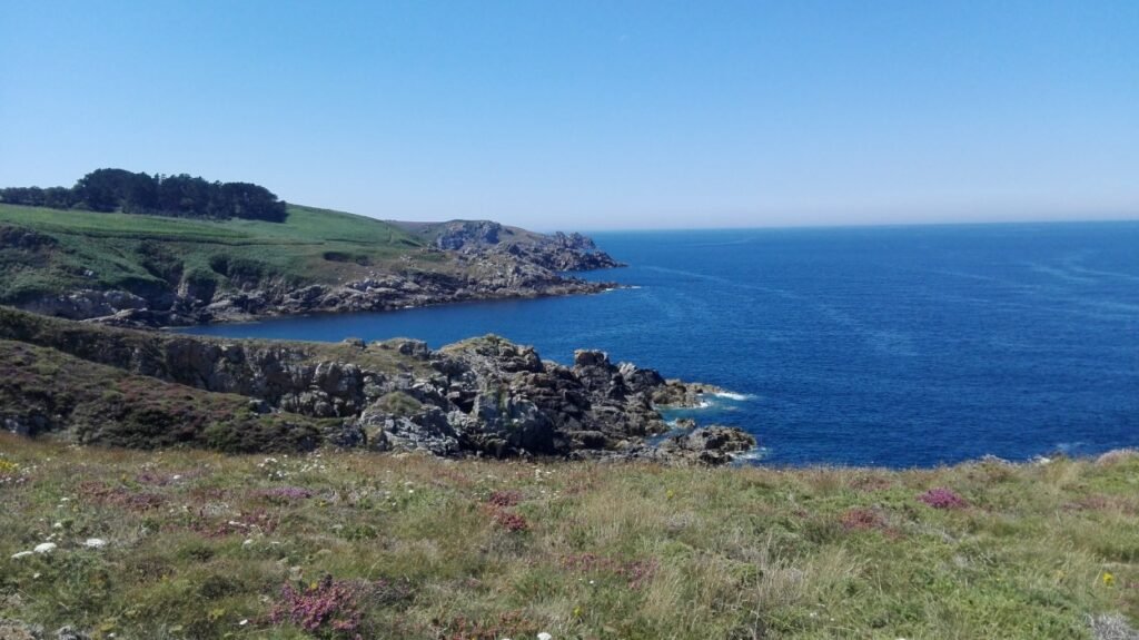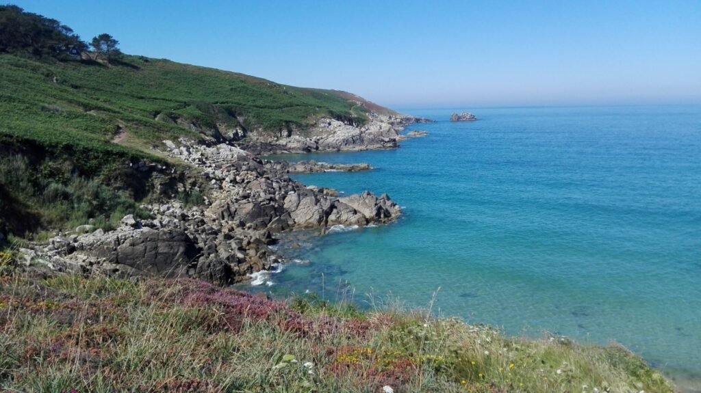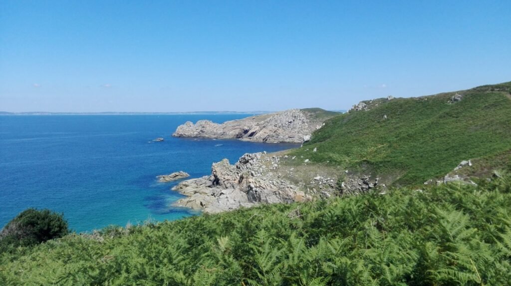 Uiteindelijk kom ik zonder kleerscheuren aan bij de Pointe de Leydé. Vanaf nu is het één en al natuurpracht. De GR loopt langs allerlei kleine baaien, grote pointes en soms ook mooie stranden. De baai net voor de Pointe de la Jument, bij Kerandraon, is prachtig. Vanaf die laatstgenoemde pointe zie je ook de Pointe du Millier en z’n eenzame witte huisje. Het is een goed mikpunt en geeft me ook een doel om naartoe te wandelen. Aan de Pointe du Millier is er helemaal geen schaduw, maar ik hoop hier even te verpozen in de schaduw die een kleine rots opwerpt. Een zwerm bijen denkt daar echter anders over en dus beslis ik om door te wandelen.
