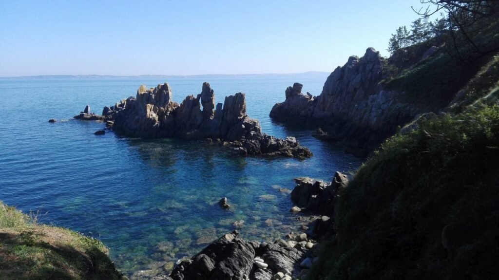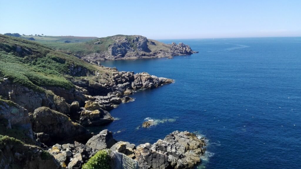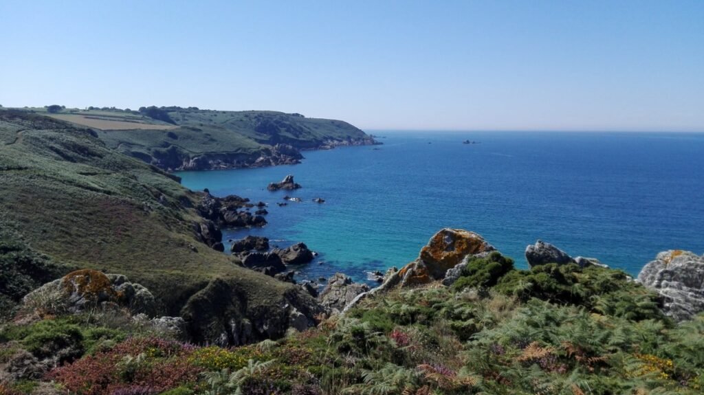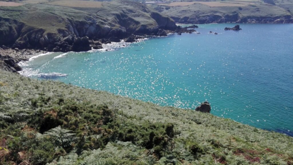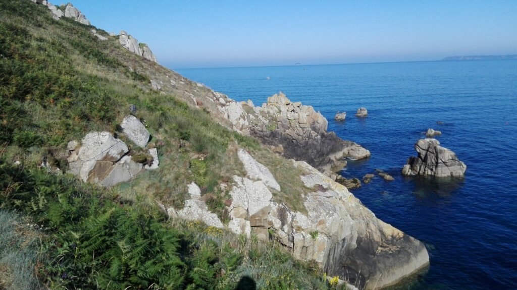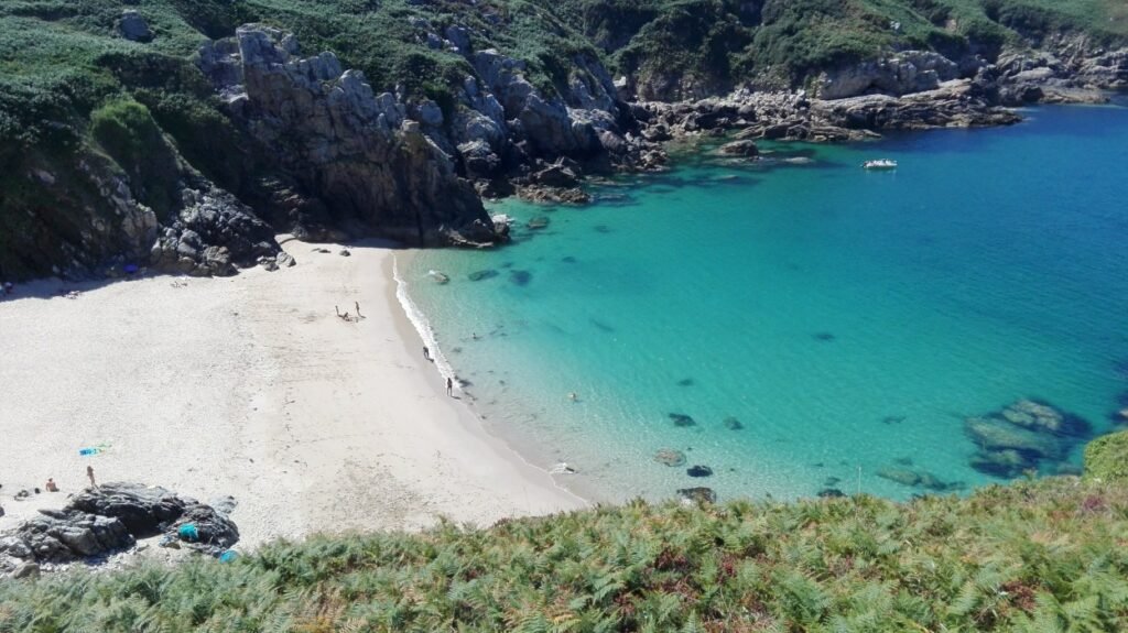 Uiteindelijk kom ik zonder kleerscheuren aan bij de Pointe de Leydé. Vanaf nu is het één en al natuurpracht. De GR loopt langs allerlei kleine baaien, grote pointes en soms ook mooie stranden. De baai net voor de Pointe de la Jument, bij Kerandraon, is prachtig. Vanaf die laatstgenoemde pointe zie je ook de Pointe du Millier en z’n eenzame witte huisje. Het is een goed mikpunt en geeft me ook een doel om naartoe te wandelen. Aan de Pointe du Millier is er helemaal geen schaduw, maar ik hoop hier even te verpozen in de schaduw die een kleine rots opwerpt. Een zwerm bijen denkt daar echter anders over en dus beslis ik om door te wandelen.