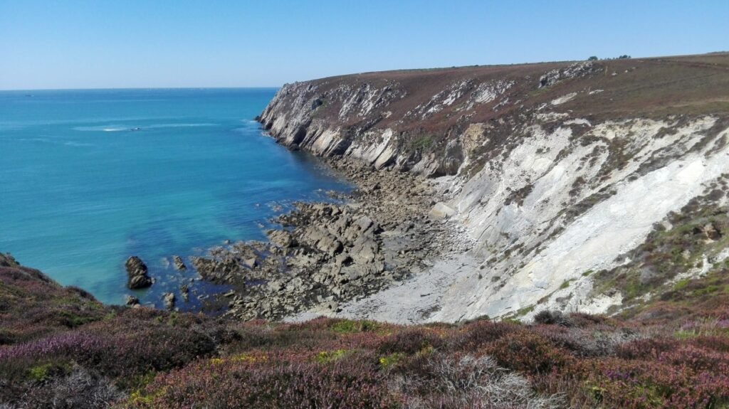 Uiteindelijk kwam ik bij het Presqu’île de Crozon, de Cornouaille en Cap Sizun terecht, allemaal deel van het departement Finistère (29). Transport leek ook niet al te moeilijk. Trein naar Brest, overzetboot naar Le Fret (op het Crozon-schiereiland). De GR34 slingert hier eveneens langs de prachtige kustlijn, eenzame baaien, ruw kustgebied en door mooie mediterraans ogende landschappen. Tot aan de Pointe du Raz is de tocht zo’n 168 kilometer lang, maar door omstandigheden (ziekte) heb ik het stukje van de Cap de la Chèvre uiteindelijk overgeslagen om mijn volgende wandeldag vroeger te kunnen beëindigen.