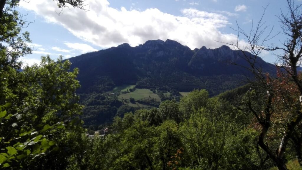 Na Armoy gaat de GR grotendeels door bossen en als ik bij Reyvroz aankom, krijg ik een prachtig panorama aangeboden. Ik heb vooral interesse in de Dent d’Oche, want de GR gaat daar immers langs. Intussen komt er heel wat lawaai uit de steengroeve van Pombourg.