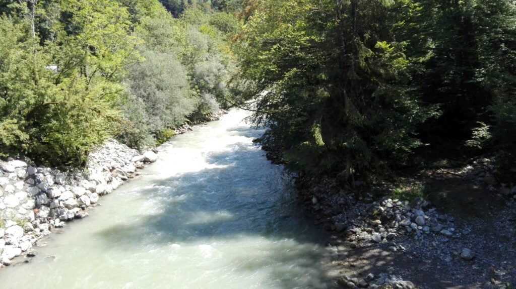 Na de oversteek van het oude bruggetje over de Dranse de Morzine ben ik even niet zeker welke richting ik uit moet. Bij de huizen aan de overkant ontbreekt precies een markering, maar al snel kom ik in de bossen de vertrouwde GR-kleuren tegen. De klim naar Les Chênes is erg steil, op losse stenen en blijft maar duren. Bij La Plantaz kies ik voor de GR-variante rechtstreeks naar Mérou via Les Girards. Uiteindelijk beslis ik om een omweg van 3,5 kilometer langs de supermarkt in Vinzier te maken voor extra waterflessen (ik ben maar met twee kleine flesjes vertrokken) en een ijsje.