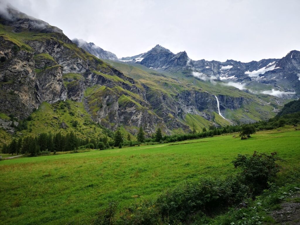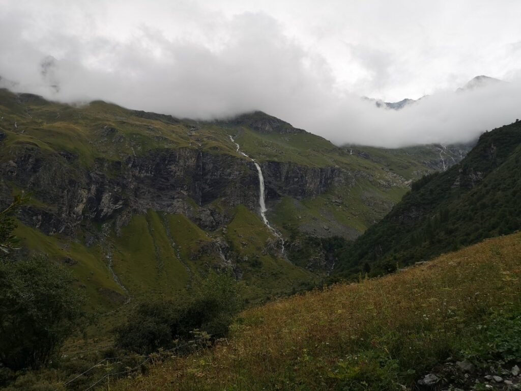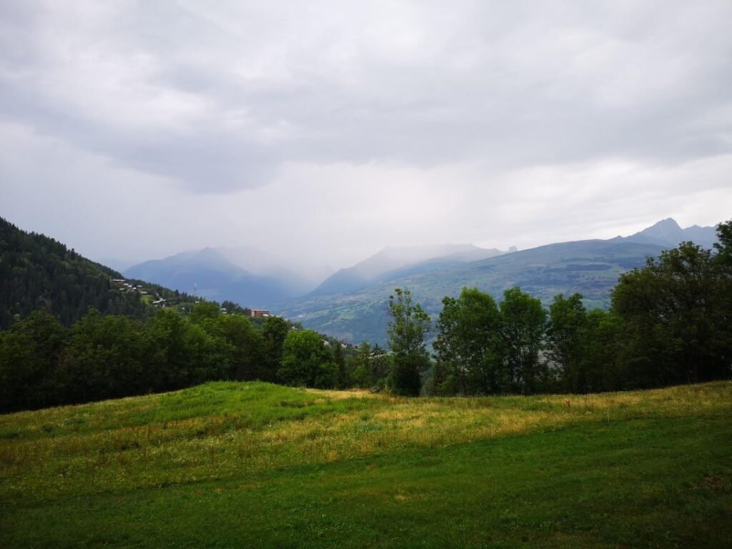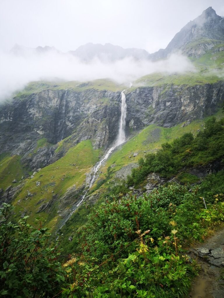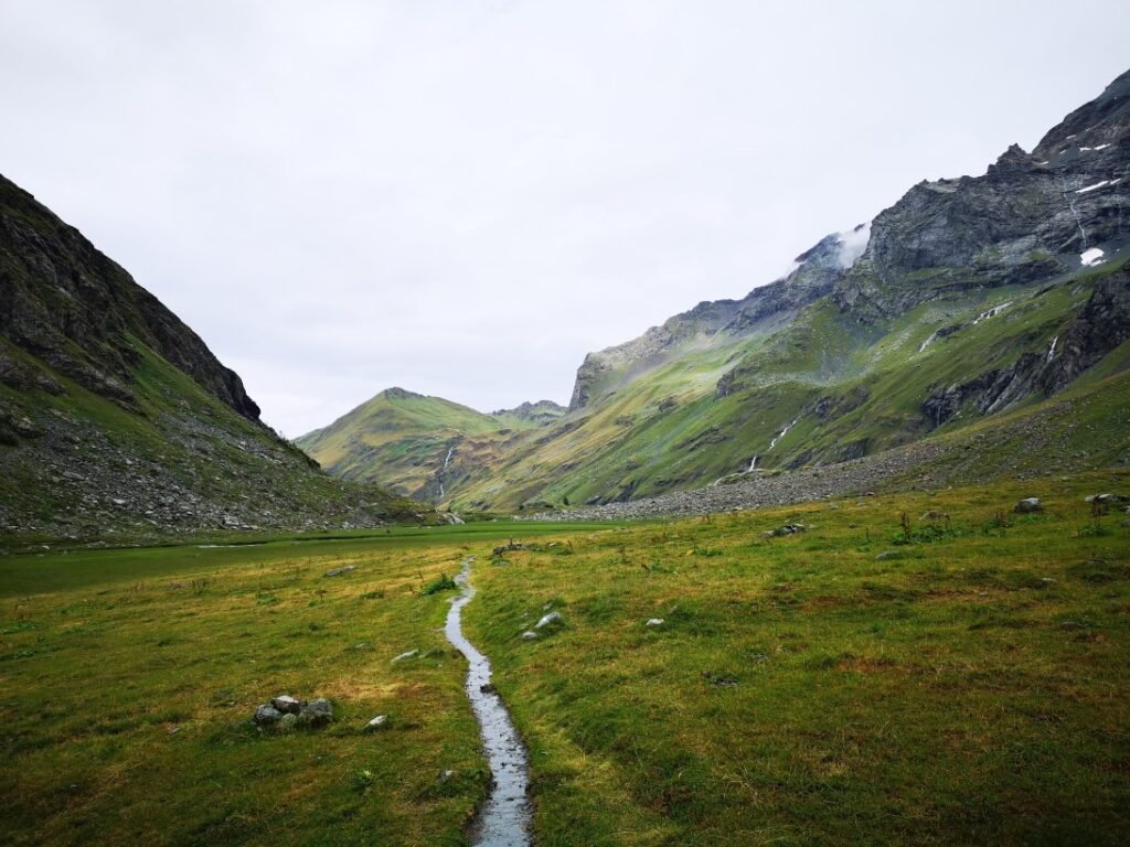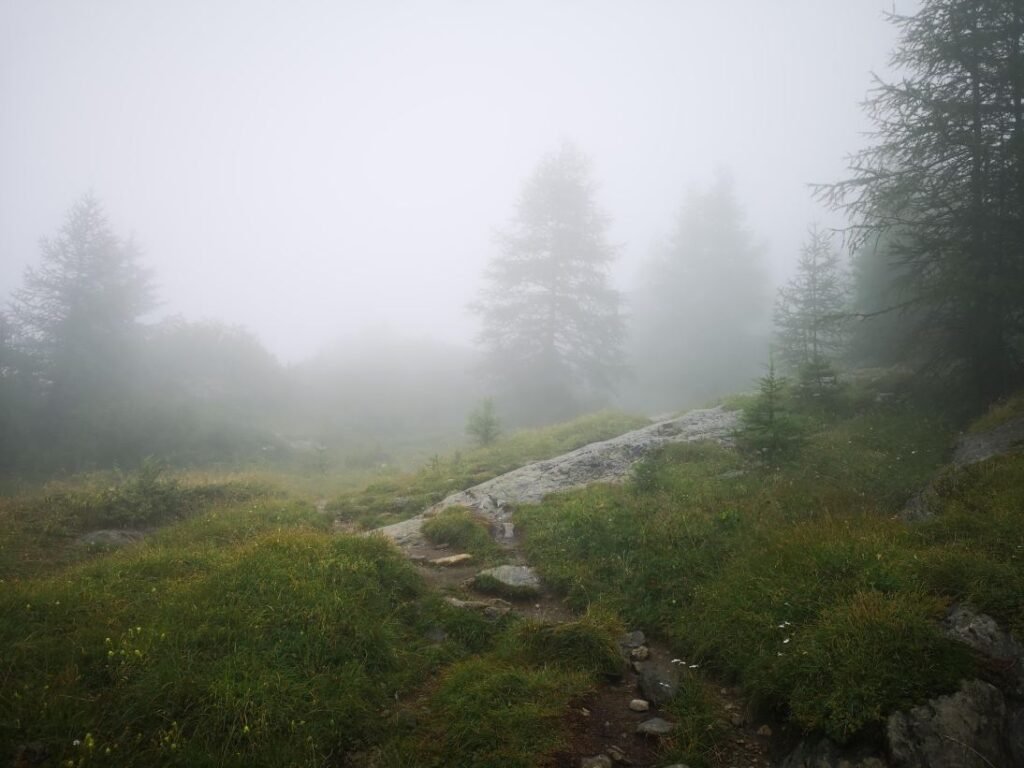 Het is ‘s nachts zo goed als droog gebleven, op enkele druppels na. Ik kan de tent dus meteen opbergen na het opstaan. Voor het ontbijt hoop ik op iets eetbaars in het volgende dorpje. De hemel ziet er bijzonder dreigend uit en dus probeer ik me zo snel mogelijk klaar te maken zodat ik toch nog even in het droge kan wandelen. Om 6u40 ben ik weg. Vanaf het dorpsplein loopt het pad meteen steil omhoog. Het duurt niet lang of de eerste druppels vallen en ook de bliksem maakt z’n opwachting. Het is een leuke wandeling tot in Peisey-Nancroix en wandelen in regen vind ik ook niet erg.