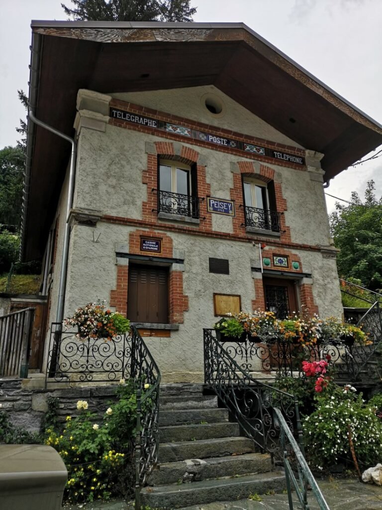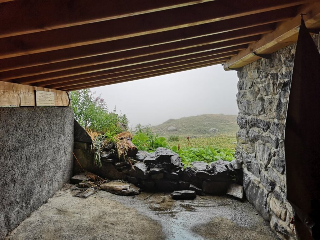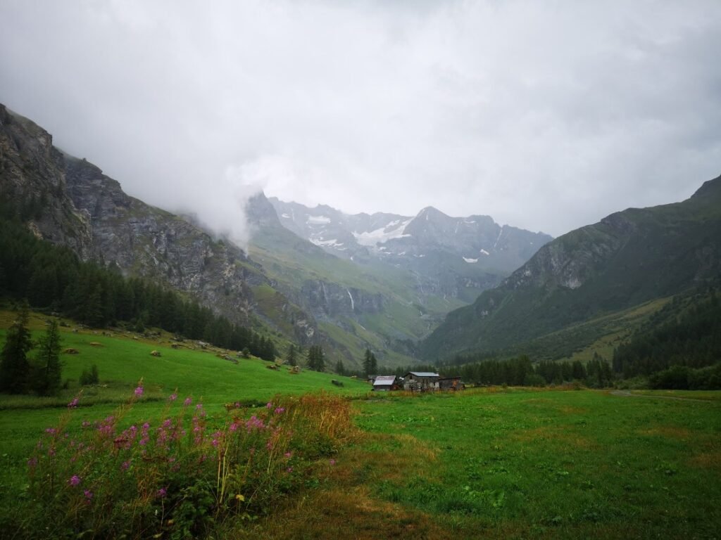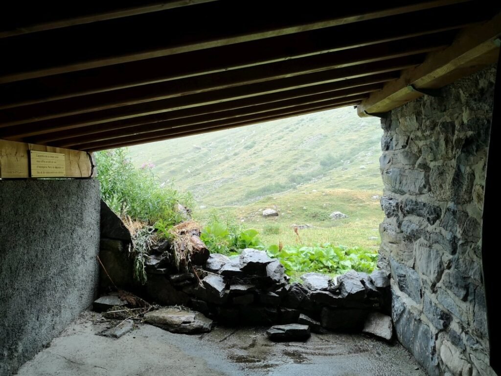 In Peisey-Nancroix (1300m) zoek ik de plaatselijke supermarkt Sherpa op. Deze heeft een ruim aanbod en dus vind ik er al het nodige voor een lekker ontbijt. Terwijl ik boodschappen doe, valt de regen met bakken uit de hemel. Mijn ontbijt verorber ik dan maar onder het gespannen afdak voor de winkel. Ik maak van een korte regenpauze gebruik om me weer op pad te begeven. De zon laat zich zelfs even zien. In Le Moulin (1284m), het volgende dorpje, heeft men overal foto’s van weleer opgehangen. Leuk om te zien dat de meeste gebouwen al meer dan 100 jaar oud zijn! Zodra ik de Ponturin ben overgestoken, begint het te druppelen. Hoe verder ik ga, hoe harder het regent. Ik vind het geweldig. In de verte zie ik een wandelaar met een rode poncho en denk even dat Vladimir voor me uit wandelt. Hij zei me gisteren echter dat hij een shuttlebus tot de Refuge van Rosuel zou nemen omdat hij te vermoeid is. Het is dan ook iemand anders. We wandelen samen langs gebouwen van het Palais de la Mine (1445m), de Franse mijnbouwschool die hier in het begin van de 18de eeuw gevestigd was.