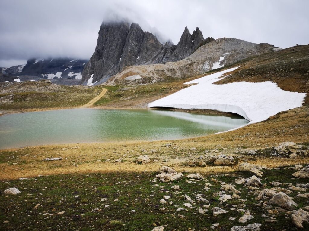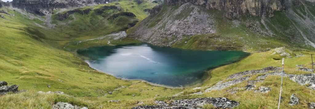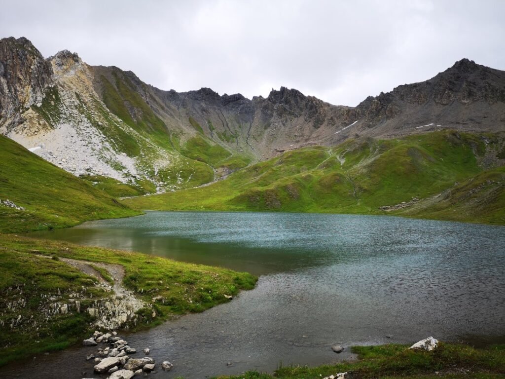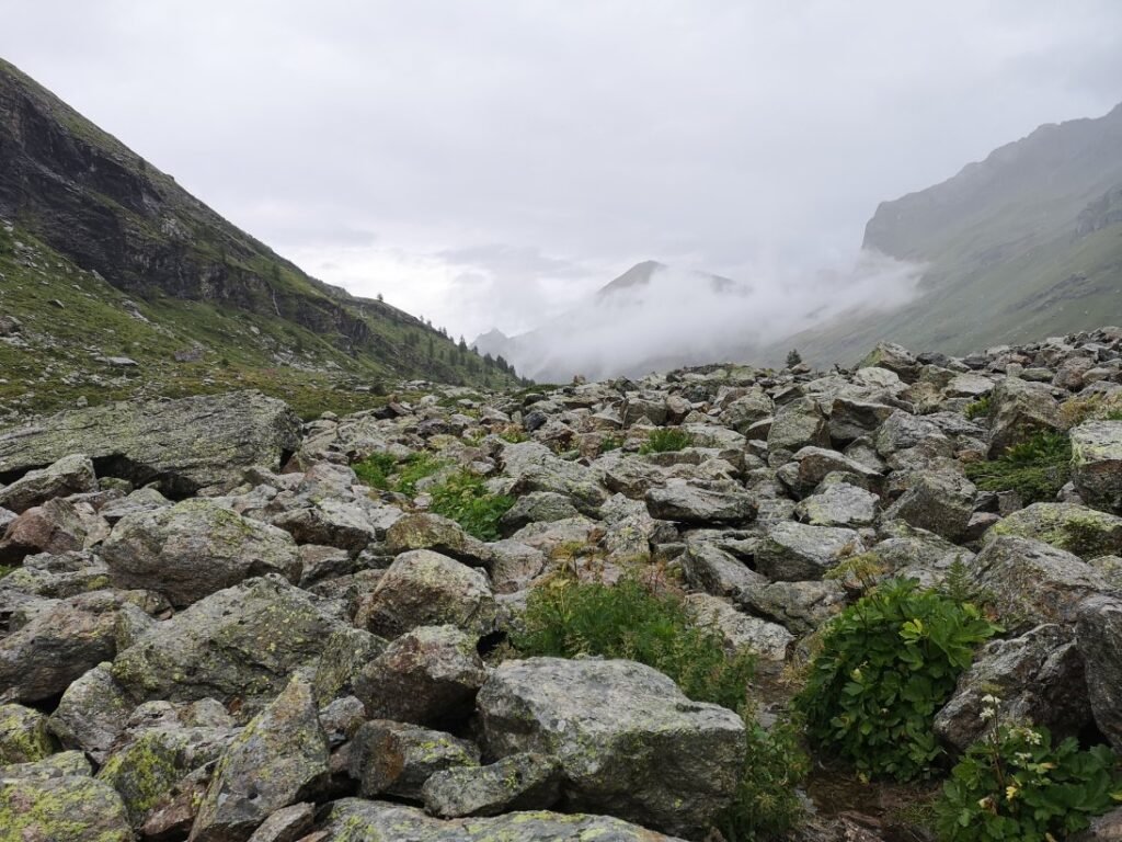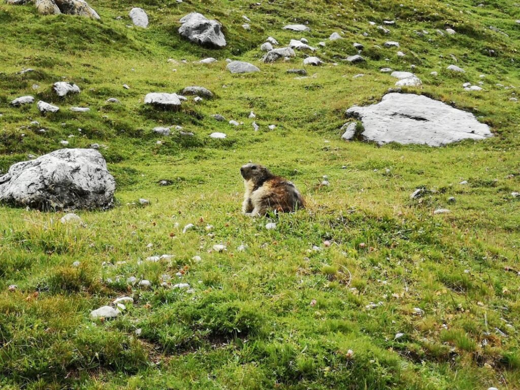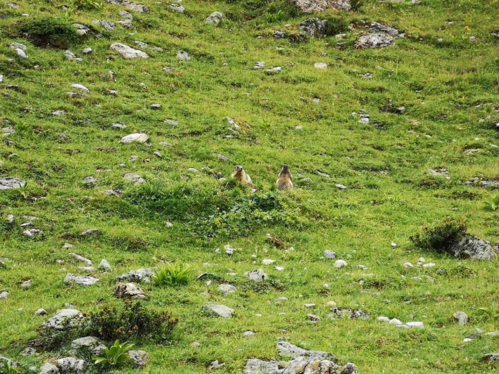 Tegen 12u45 waag ik me uit mijn schuilplaats. Ik kan terug meer dan 10 meter voor me zien en nu wandel ik door een leuk rotsblokkenveld aan de Perte du Ponturin (2068m. Het regent opnieuw hard, maar de zichtbaarheid is goed. Overal werden er stroompjes gevormd door de zware regenval en ik ben niet helemaal zeker waar hier het pad loopt, maar ik weet dat ik omhoog moet, dus veel kan hier niet verkeerd gaan. Ik zie ook iemand voor me uit wandelen. Eens we in de vlakte van de Plan de la Plagne (2100m) zijn, kan ik aansluiten bij de wandelaar. Het is Vladimir die de schuilhut niet had gezien en in het onweer verder is blijven wandelen. Zijn schoenen zijn doordrenkt van de regen. We wandelen samen verder. Aan de Cabane des Mindières (2224m) zien we de eerste marmotten van de dag en krijgen we een fantastisch panoramisch zicht op het Lac de la Plagne. Daarnaast kunnen we ook de Refuge Entre le Lac (2151m) zien. Het is inmiddels ook opgeklaard en het zal droog blijven tot ik in Val Claret ben. De marmotten houden ons tot aan de Refuge du Col du Palet (2587m) gezelschap. De vermoeidheid van het vele klimmen laat zich stilaan voelen bij mij. Ik kan Vladimir niet meer volgen en hij is ruim een kwartier voor me aan de refuge. De laatste drie kilometer tot aan de refuge lijken een eeuwigheid te duren. Ik ben blij als ik daar even kan uitblazen. Ik ga kort naar binnen om uit de koude wind te blijven. Vladimir is ook doodop en hij zal in de refuge blijven.