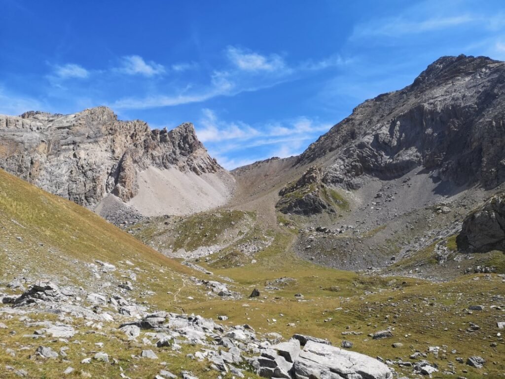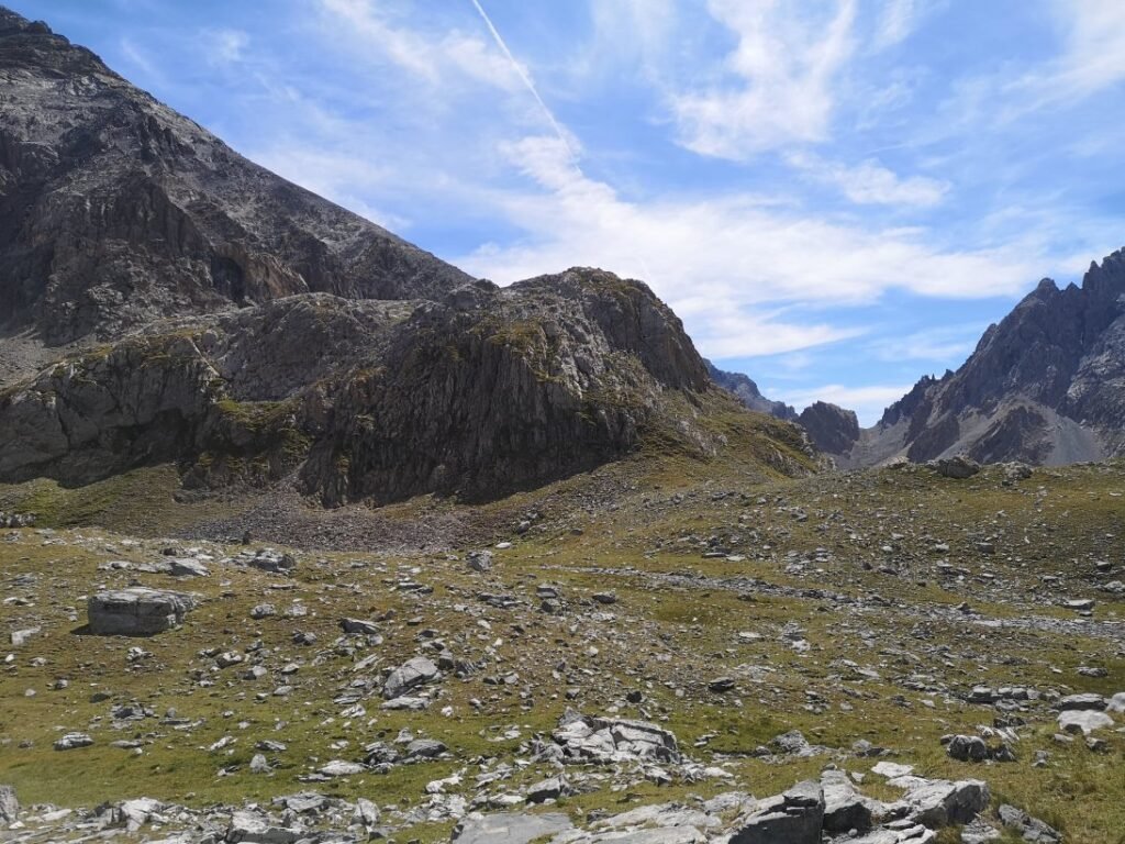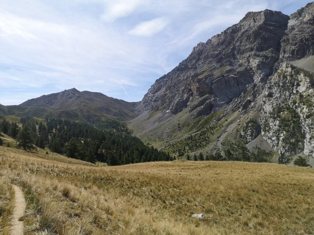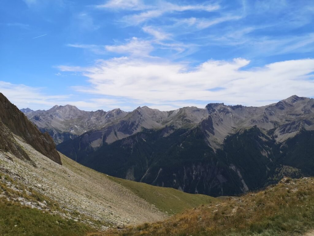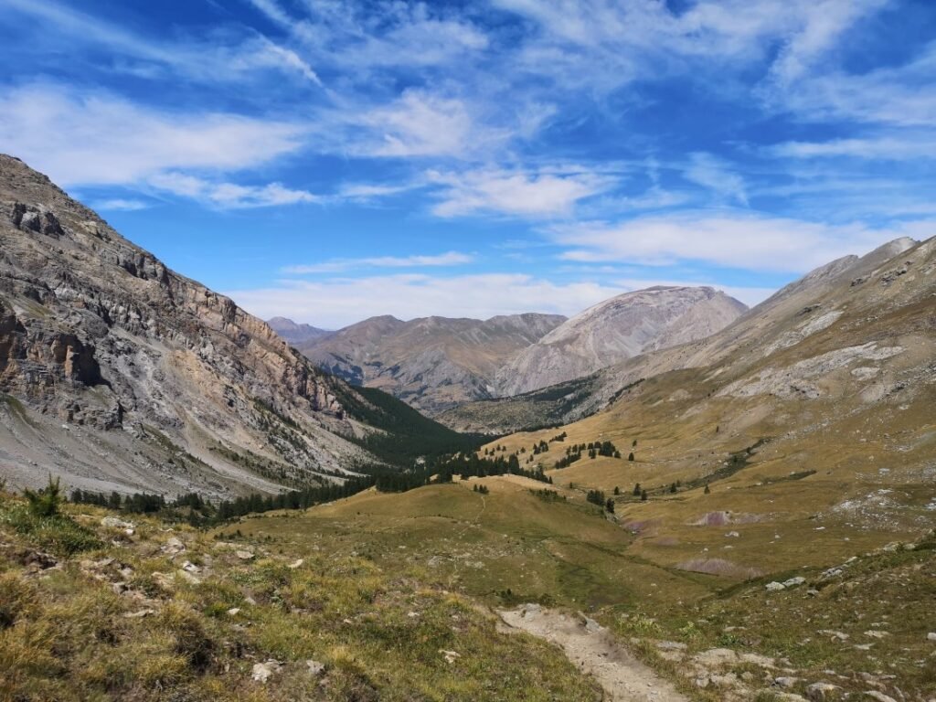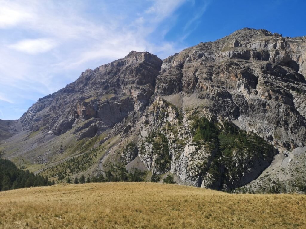 In de ruïnes houd ik halt voor een middagpauze, terwijl ik de omgeving verken. Na drie kwartier begin ik aan de laatste 150-meterklim naar de Col de Mallemort (2558m). Vanop de col kijk je naar de vallei waarin Larche ligt, alleen kan je het dorp net niet zien. De afdaling duurt zo’n 2 uur en is niet zo moeilijk of steil (of voelt althans niet zo). Op verschillende stukken liggen er wel kleine steentjes die ervoor zorgen dat je gaat schuiven. Marine, Stevie en ik moeten goed uit onze doppen kijken zodat we niet vallen.