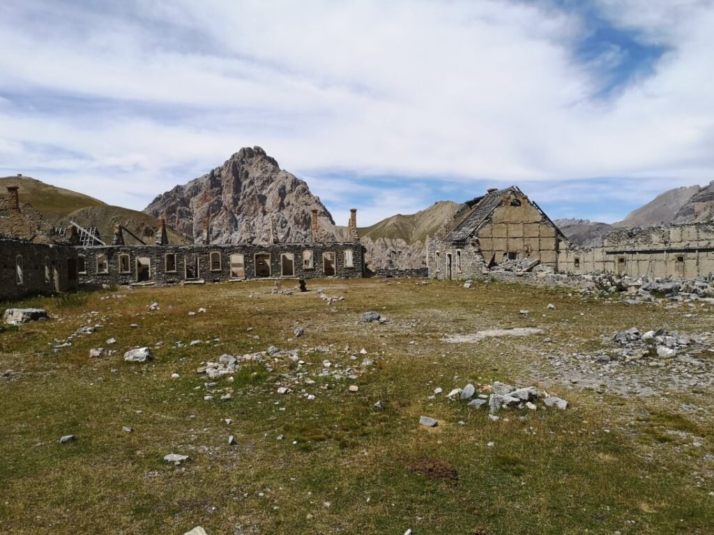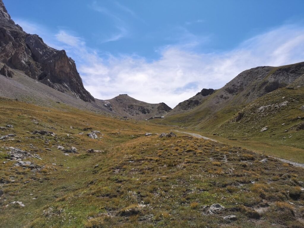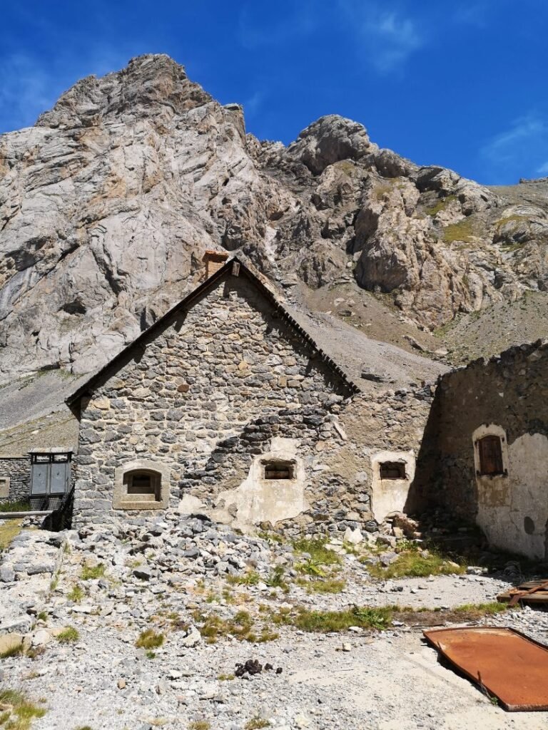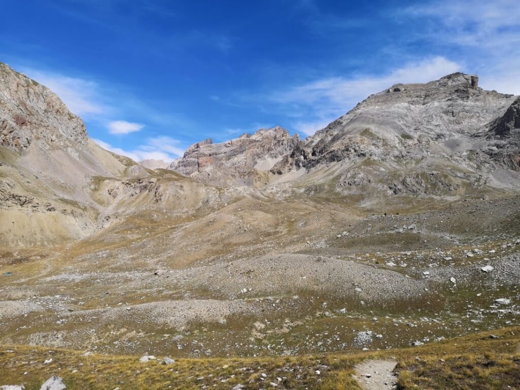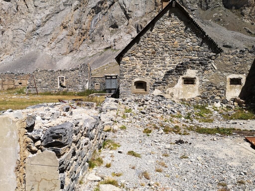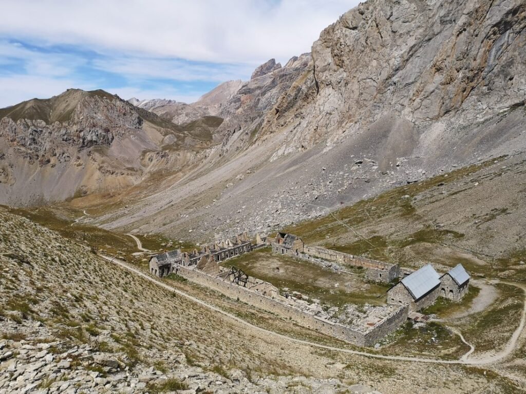 Vladimir heeft last van z’n knie en kiest om nog even te rusten aan het fort. Met Stevie en Marine gaat het verder omhoog naar de Col du Vallonet (2624m) waarna zich een fantastisch landschap openbaart. Het is hier veel ruwer en droger dan voor de col. Gelukkig staat hier ook een windje, want tijdens de klim maakt de hitte het stappen best zwaar. Na een korte daling stijgt het pad opnieuw om een bredere weg te vervoegen naar de ruïnes van de militaire barakken onderaan de Col de Mallemort. Hier werden de manschappen gehuisvest die bovenop de Tête de Viraysse (2772m) een batterij bemanden. Vanaf deze top konden de Fransen drie valleien verdedigen. Dit zijn ook niet de enige verdedigingswerken in deze regio, want de hele vallei waarin Larche ligt, is bezaaid met 19de-eeuwse forten.