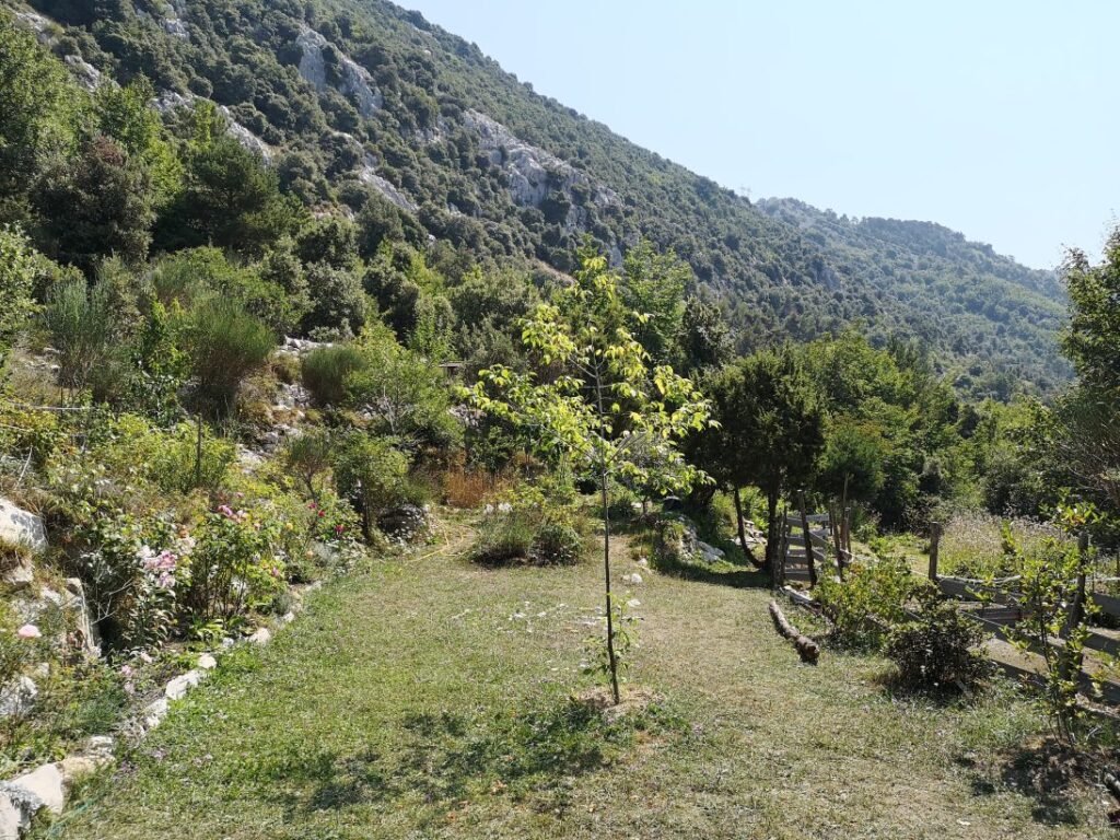 Niet veel later kunnen we die vreugde delen met Perrine, Mathieu en Henri, die ons bij enkele ruïnes inhalen. Samen gaan we aan een hels tempo verder langs de Colla Bassa (1108m) en vinden bij Mourga een bijzondere plek: een tuin waarin een jongedame aan permacultuur doet. Wandelaars worden uitgenodigd om even plaats te nemen en in de schaduw van enkele bomen en een parasol te ontspannen, al dan niet met een drankje. Met z’n vijven maken we er een picknick van en halen al het eetbare uit onze rugzakken. We hebben nu geen tijdsdruk meer.