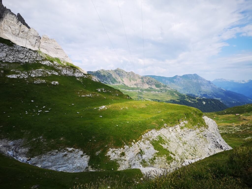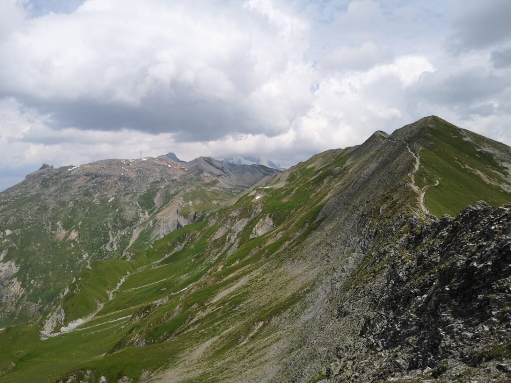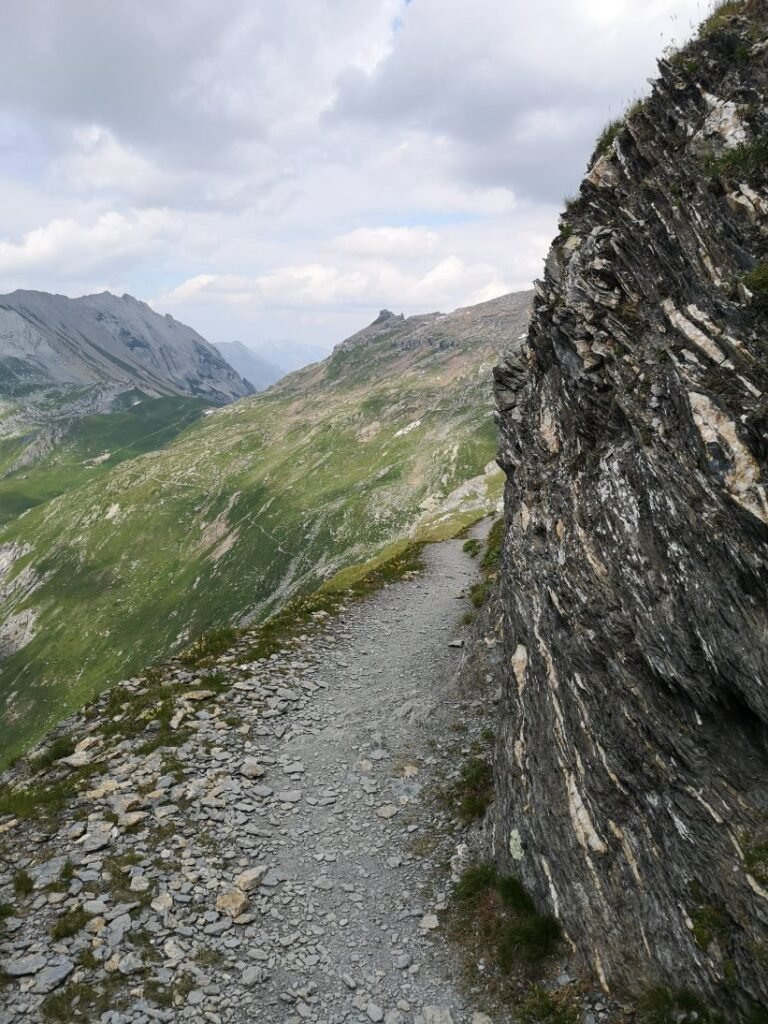 De tweede reden waarom ik niet naar deze wandeldag uitkeek, was het stukje van drie kilometer over de Crête des Gittes (hoogste punt 2538m). Hoewel het pad weliswaar over een bergkam gaat en je dus langs beide zijden naar beneden kan kijken, viel het stuk al bij al nog mee. De vergezichten en het 360-gradenpanorama maken het wel bijzonder. Vanuit de refuge ziet het er ook veel gevaarlijker uit dan het in werkelijkheid is. Omstreeks 15u sta ik met iets vastere voet op de grond aan de Col de la Sauce (2307m). Intussen is het ook helemaal opgeklaard en is het in de volle zon ontzettend warm. De afdaling is best steil en gaat enigszins cross-country. Ik hou er zelfs een geschaafde teen aan over. Kort voor de Chalets du Plan de la Lai (1823m) doe ik mijn voeten in het verfrissend koude water van een beekje. Zalig!