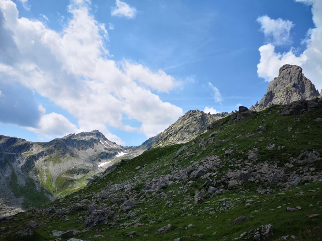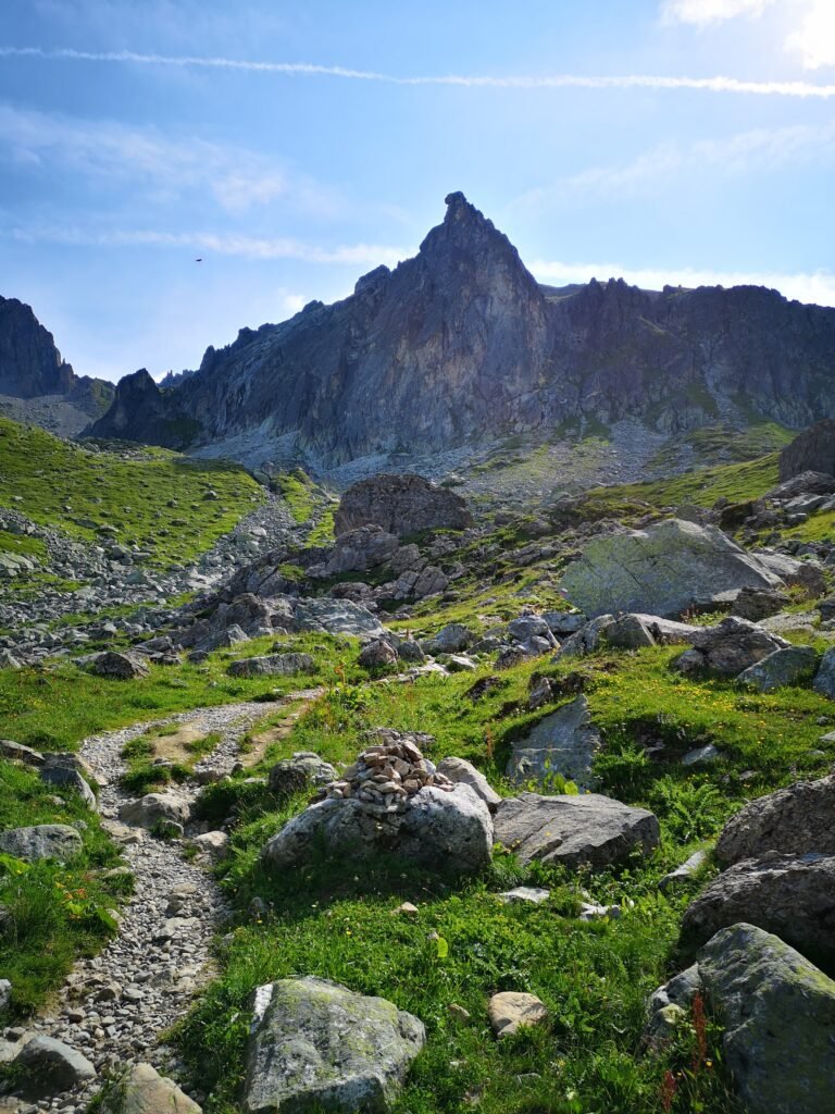 Gisterenavond heb ik nog kunnen opvangen dat het kort na het middaguur zwaar zou onweren, dus blijf ik deze morgen niet te lang plakken en ben om 7u op pad. Aan de oude refuge van Le Mora spot ik een eenzame marmot. De eerste van velen die ik op deze trektocht zal tegenkomen. Met het invallende zonlicht doet het landschap me niet meteen aan de Alpen denken, maar heeft eerder iets Mediterraans.