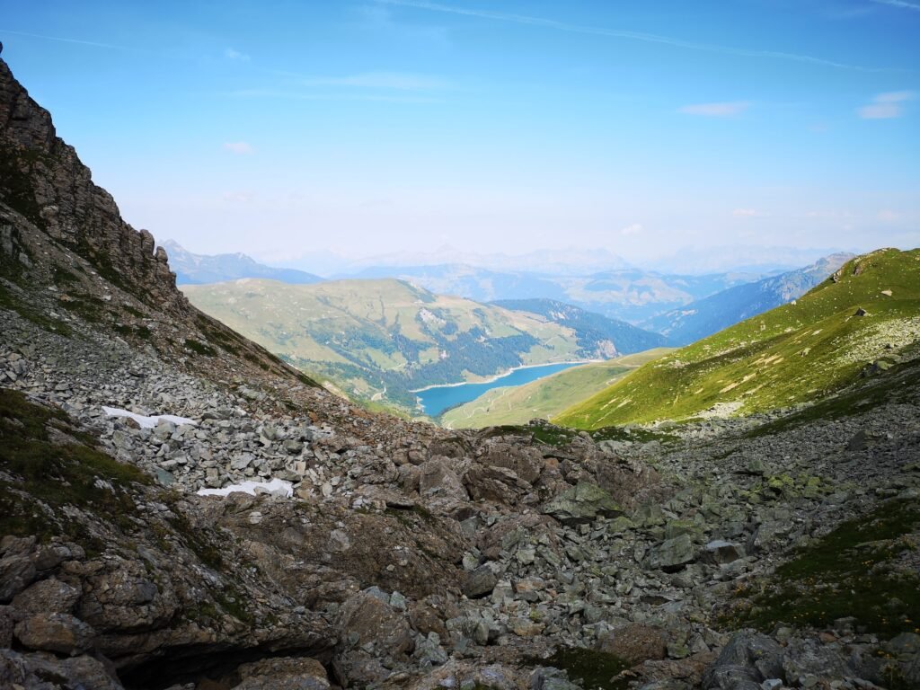Het is pas bij de Grande Berge dat je een degelijk zicht op het enorme Lac de Roselend krijgt. Het pad loopt voortdurend op en af en omdat ik niet te lang wil treuzelen met het voorspelde slechte weer ga ik ook niet naar de Belvédère voor een panoramisch zicht op het meer. Aan hoogte 1910, boven Treicol, krijg je ook voor het eerst een duidelijk blik op de Col de Bresson evenals de Tête du Lion, die effectief op een leeuwenkop lijkt, en de Pierra Menta (2714m). Ik krijg het een beetje benauwd als ik de muur zie die voor me opdoemt. Ik zie wel een weg omhoog gaan, maar dat lijkt me allemaal best steil. Intussen staat de zon ook hoog genoeg en net voor de ruïnes van de Presset-boerderij voel ik de hitte in mijn nek. Al bij al valt de klim naar de Bresson nog mee en om 11u30 kom ik er reeds aan. Onderweg heb ik een leuke babbel gehad met een man die de GR5 in tegenovergestelde richting tot de Lac Leman doet. Onder de Tête du Lion ga ik een kort gesprek aan met een jonge bergwandelgids die zijn ‘kudde’ wandelaars van de Refuge de Presset (2504m) naar beneden leidt.