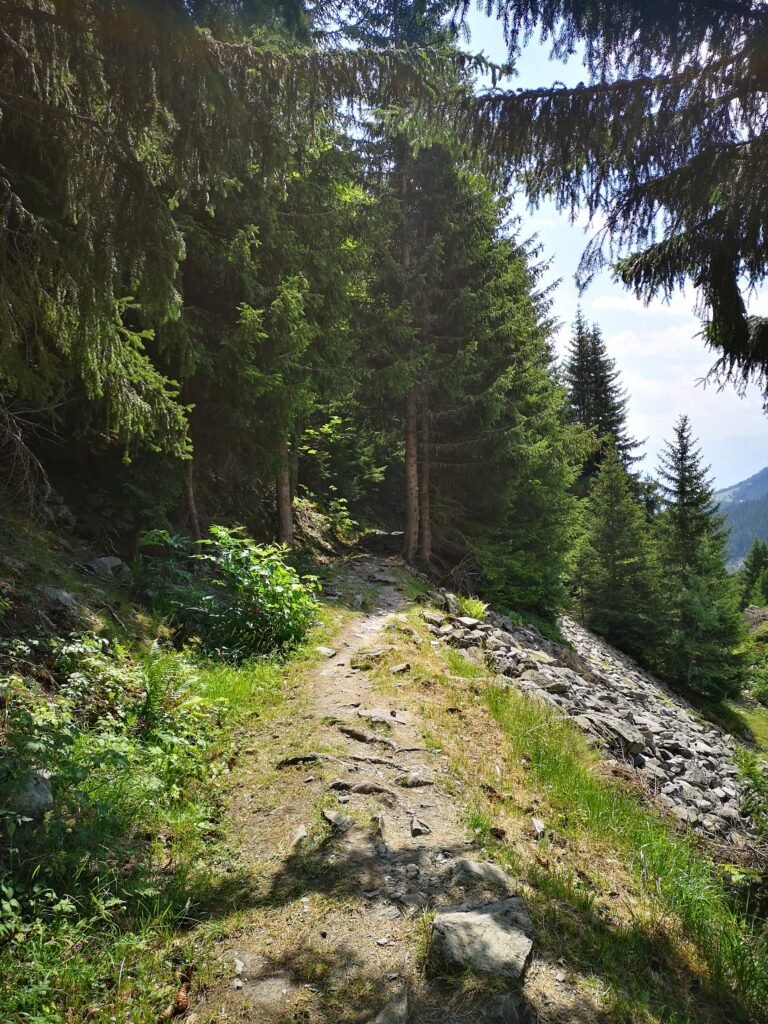 Ter hoogte van de kapel van Saint Guérin heerst er even verwarring. Ik volg de GR-tekens en bij de twee oude schuren moet ik blijkbaar linksaf naar het hogerop gelegen pad, maar er is geen enkel zichtbaar pad hier beneden tenzij rechtdoor en dat lijkt dood te lopen. Dus ga ik even dwars door het hoge gras en sluit wat hoger op het pad aan. Wat verder duikt het pad het bos in en dat zorgt bij deze hitte voor welgekomen verkoeling. Het aantal mieren dat ik hier over de grond zie kruipen is ook indrukwekkend. Wat verder bij Les Chavonnes (ca. 1600m) beschrijven informatiepanelen de oorsprong van dit pad. Oorspronkelijk was dit een handgegraven kanaal dat echter door lawines verwoest werd. Op bepaalde plaatsen kan je nog de (bak)stenen overblijfselen zien.