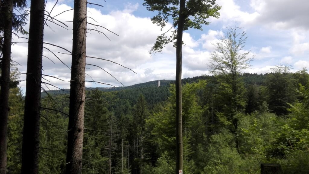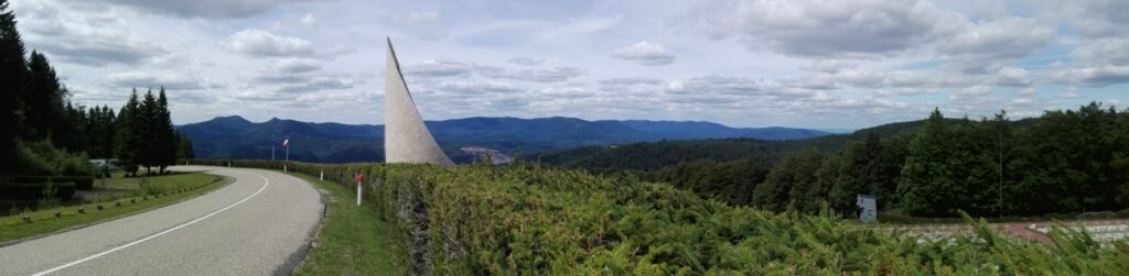 Met enige minuten vertraging komen we omstreeks 13u15 in het station van Schirmeck-La Broque aan. Daar vullen we nog snel onze watervoorraad aan in de Intermarché die naast de spoorweg ligt. Het is zonnig en niet te warm, dus ideaal wandelweer. Ik ken deze eerste etappe nog van vorig jaar en weet dat we vanaf Schirmeck (315m) al meteen moeten stijgen om het concentratiekamp te bereiken dat op bijna 800m ligt. Eerst nemen we achter de kerk een trap, om dan over de tunneluitgang van de D1420 naar het Château en zijn Mariabeeld te gaan. Van hieruit heb je nog een mooi zicht op Schirmeck en in de verte ook de Donon. Na een kilometer komen we aan het Croix Walter, waar we het bos in trekken. Vorig jaar kreeg ik hier af te rekenen met een losse schoenzool. Gelukkig blijft nu alles op zijn plaats.