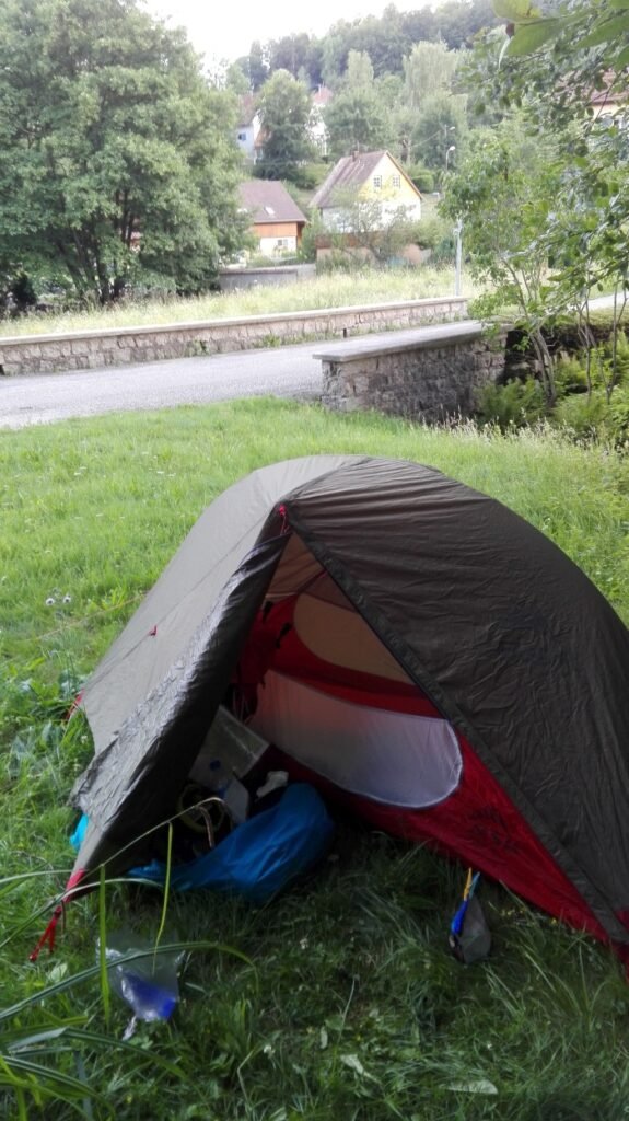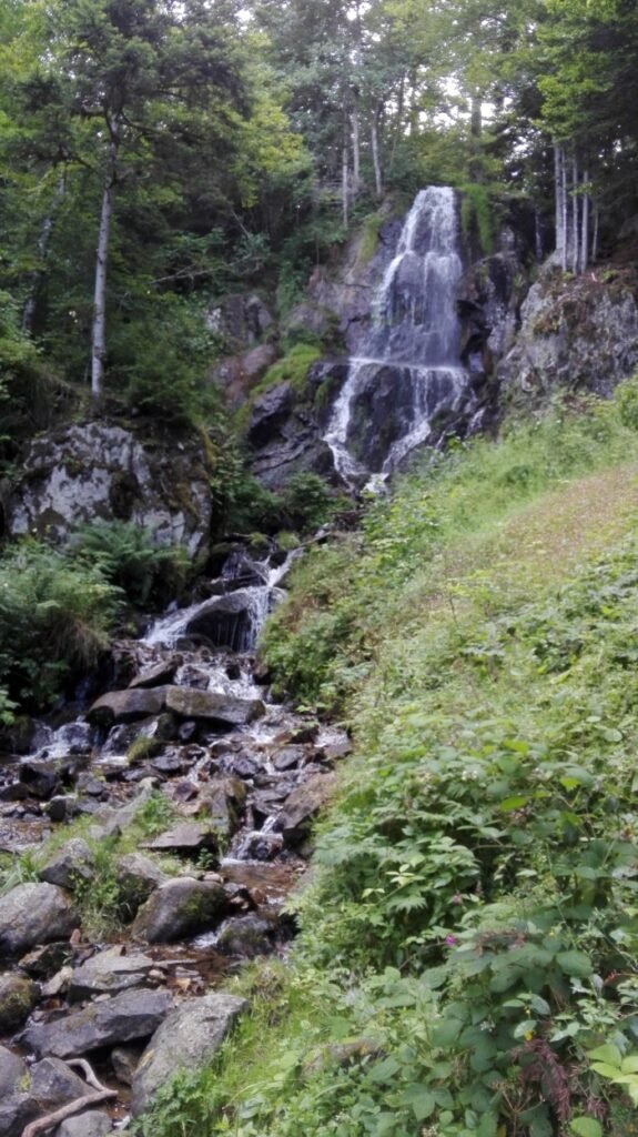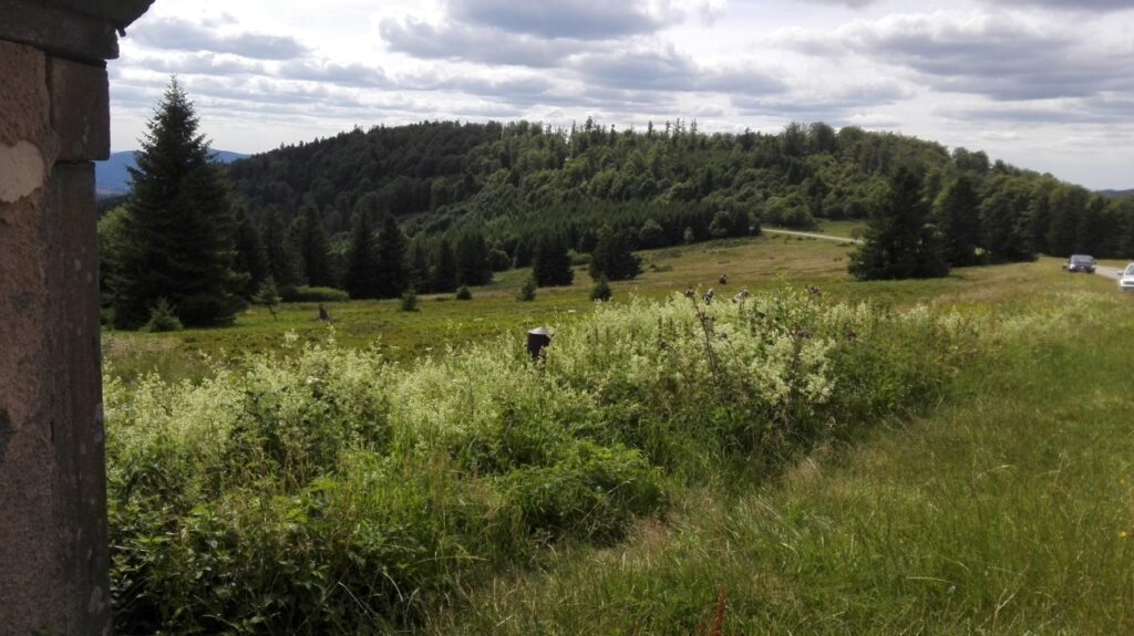 We gaan verder langs de GR die zowat parallel aan de D214 loopt. Na opnieuw anderhalf uur bereiken we omstreeks 18u00 het Champ du Feu (hoogte 1077m). Hier houden we drie kwartier halt om de voeten een beetje rust te gunnen. Ik probeer de ongemakken door blaren immers tot een minimum te beperken en daar hoort dus ook het regelmatige rusten en schoenen uittrekken bij. Tenslotte gaat het naar beneden, langs de Source de l’Andlau, richting de waterval van de Andlau. Eerst moeten we nog over omgezaagde boomstammen klauteren. Tot slot komen we tegen 20u in Le Hohwald aan. Eerst denken we op de speelplaats van het schooltje, annex Mairie, een ideale bivakplaats gevonden te hebben. Maar bij nader inzien ligt het gras vol stenen. We gaan dus nog wat verder en net voor het brugje over een zijriviertje van de Andlau, vinden we een kleine grasvlakte naast de weg. Op enkele meters levert een fontein ook nog water.