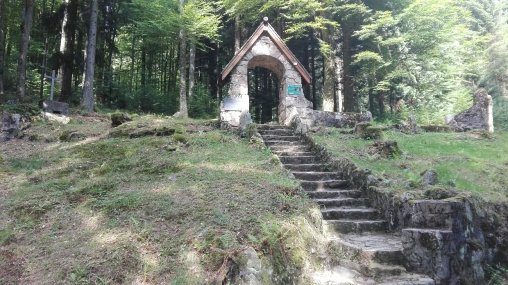 Al bij al heb ik goed kunnen slapen. Ik vertrek omstreeks 7u30. Eerst passeer ik nog een mozaïek dat de Duitsers hier tijdens de Eerste Wereldoorlog gemaakt hebben. Het betreft het embleem van het bataljon Friedberg van het Infanterieregiment 48 van de Landsturm. Jammer genoeg heb ik hiervan geen foto gemaakt. Ik daal geleidelijk aan af naar de Col de Bagenelles (904m). Daar blijkt een refuge van de Club Vosgien te zijn, maar de gastheren zouden er allesbehalve vriendelijk zijn, dixit de man die ik gisteren aan de Abri op de Petit Brézouard tegenkwam.
