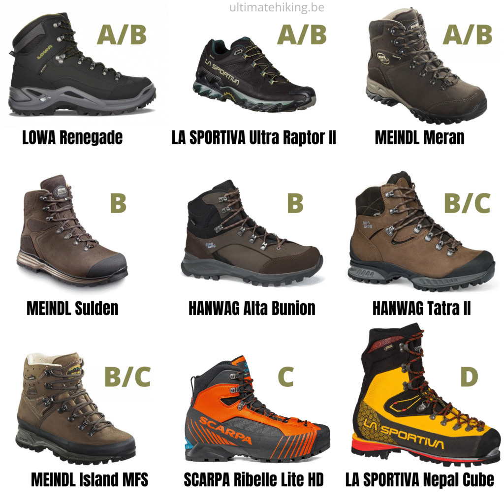 B / C | De B / C lijkt heel sterk op de B, maar heeft de optie om lichte stijgijzers om te doen. | 650 – 900 gram | Zware wandelpaden, rotsen, bergen, met zware bepakking. |