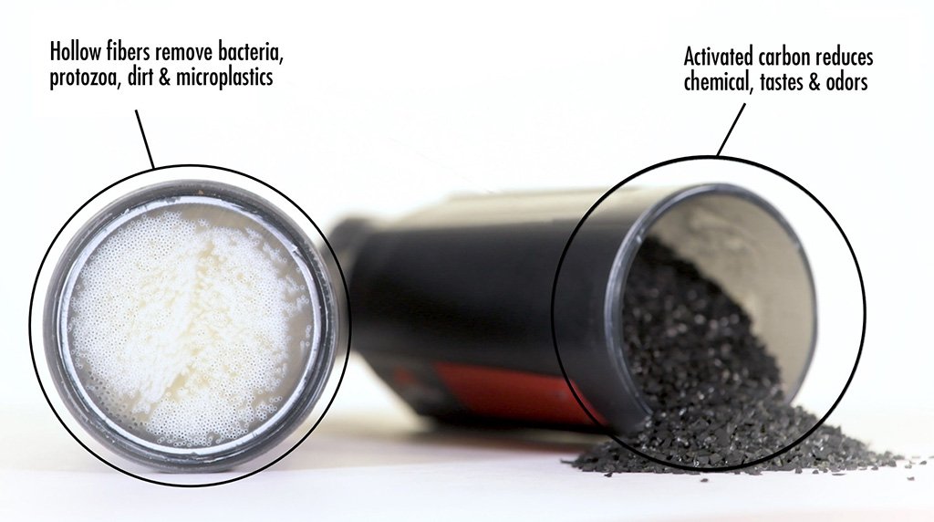 Actieve koolstof wordt aan filters toegevoegd om geuren en slechte bijsmaken te neutraliseren, maar bindt ook chemicaliën aan zich. Dat is goed, want dat betekent dat chemische stoffen die zich in de natuur kunnen bevinden, al dan niet door industriële vervuiling, door de koolstof uit het water gehaald worden. Dat heeft echter zijn grenzen. In de draagbare waterfilters en -zuiveraars die ook chemicaliën filteren zit er actieve koolstof die het ergens tussen 100 en 400 liter lang uithoudt. Daarna verliest het zijn filtereffectiviteit tegen chemicaliën en krijg je ook weer een vieze smaak van het water. In dat geval moet je dus het filterelement vervangen. Bij de producten van Grayl, veruit de betere op de markt, moet je dan ook om de 150 à 250 liter water het hele filterelement vervangen.