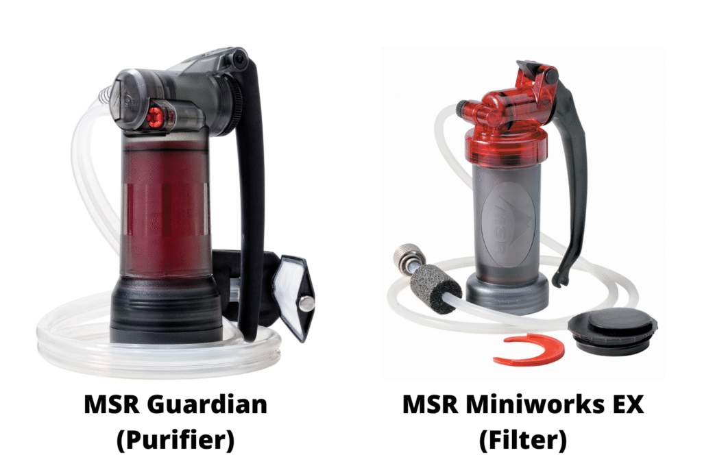 Zoals je in bovenstaande lijst kon zien, zijn virussen de kleinste pathogenen die je in water kan tegenkomen. Een gewone waterfilter kan virussen echter niet uit het water zuiveren omdat de poriƫn van die filter (het gaat in de meeste gevallen om een holle vezelfilter) te groot zijn, namelijk meer dan 0,1 micron oftewel 0,0001mm. Om virussen te verwijderen heb je een waterzuiveraar of purifier nodig. Er is dus een onderscheid tussen filteren (bacteriƫn en protozoa) en zuiveren (ook virussen). Aan de buitenkant zal je het verschil tussen een filter en zuiveraar niet zien. Vergelijk de MSR Guardian en de MSR Miniworks EX. Enkel op microscopisch vlak zie je dat waterzuiveraars fijnmaziger zijn met poriƫn van 0,02 micron.